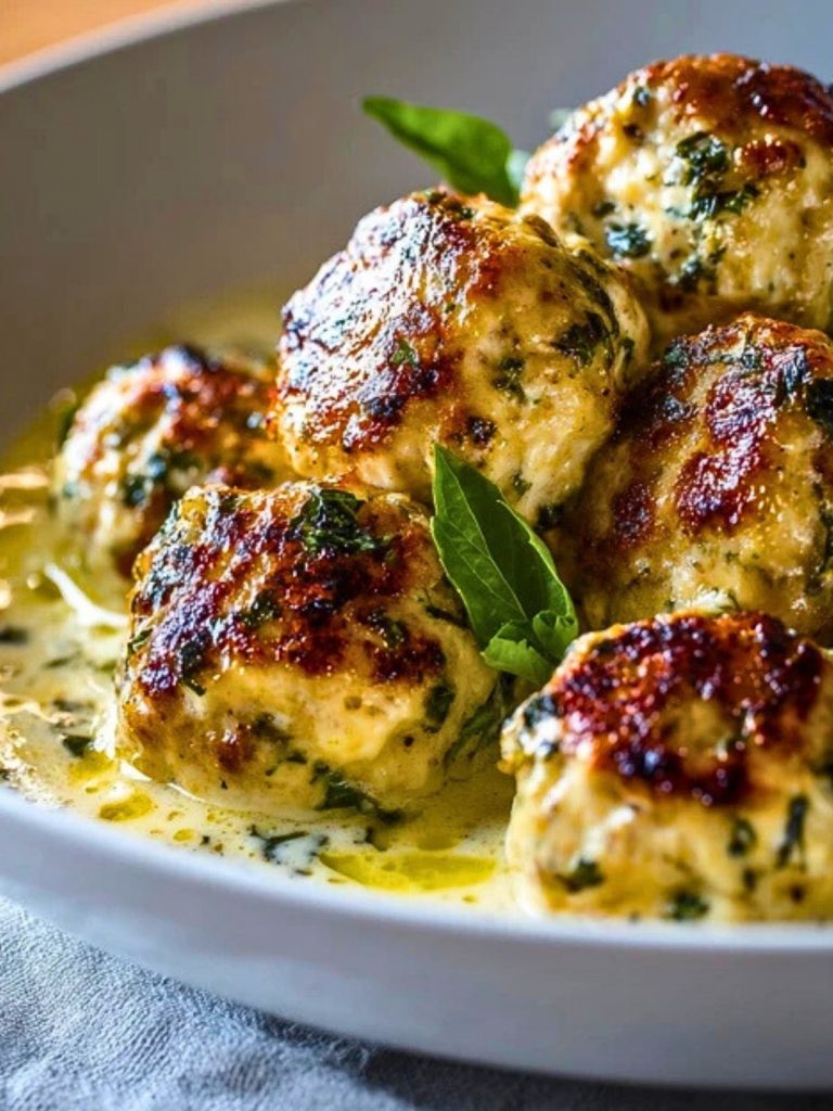 8. (Optional Sauce) In a skillet, melt butter, add garlic, cream, Parmesan, and herbs. Simmer and drizzle over meatballs.