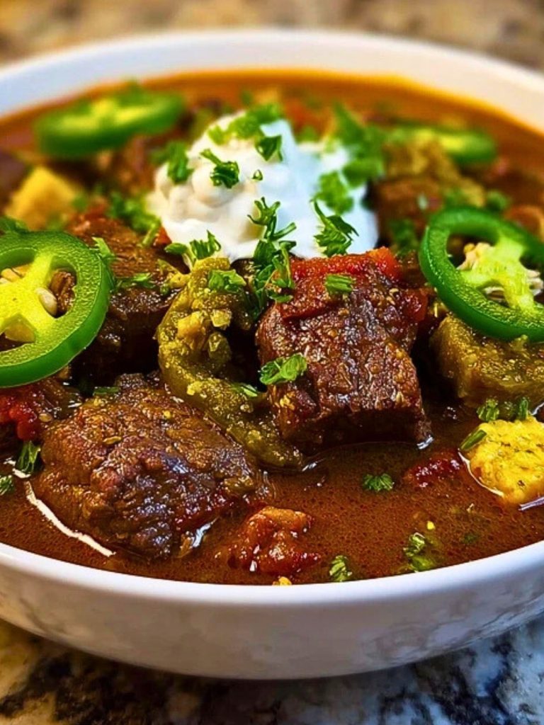 Taste and adjust seasoning if needed. Ladle the stew into bowls, then top with a dollop of sour cream, fresh jalapeño slices, and a sprinkle of chopped parsley for color and freshness. Serve warm and enjoy the comforting depth of this hearty dish.