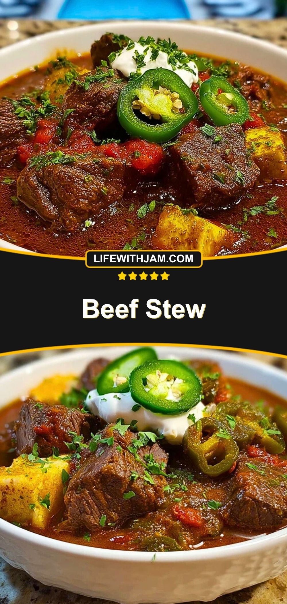 Serve this beef stew hot, straight from the pot with a spoonful of sour cream and thinly sliced jalapeños on top. It pairs beautifully with crusty bread or even over a scoop of buttery mashed potatoes. If you want to get fancy, serve it in a bread bowl or alongside a fresh green salad for a comforting, complete meal.