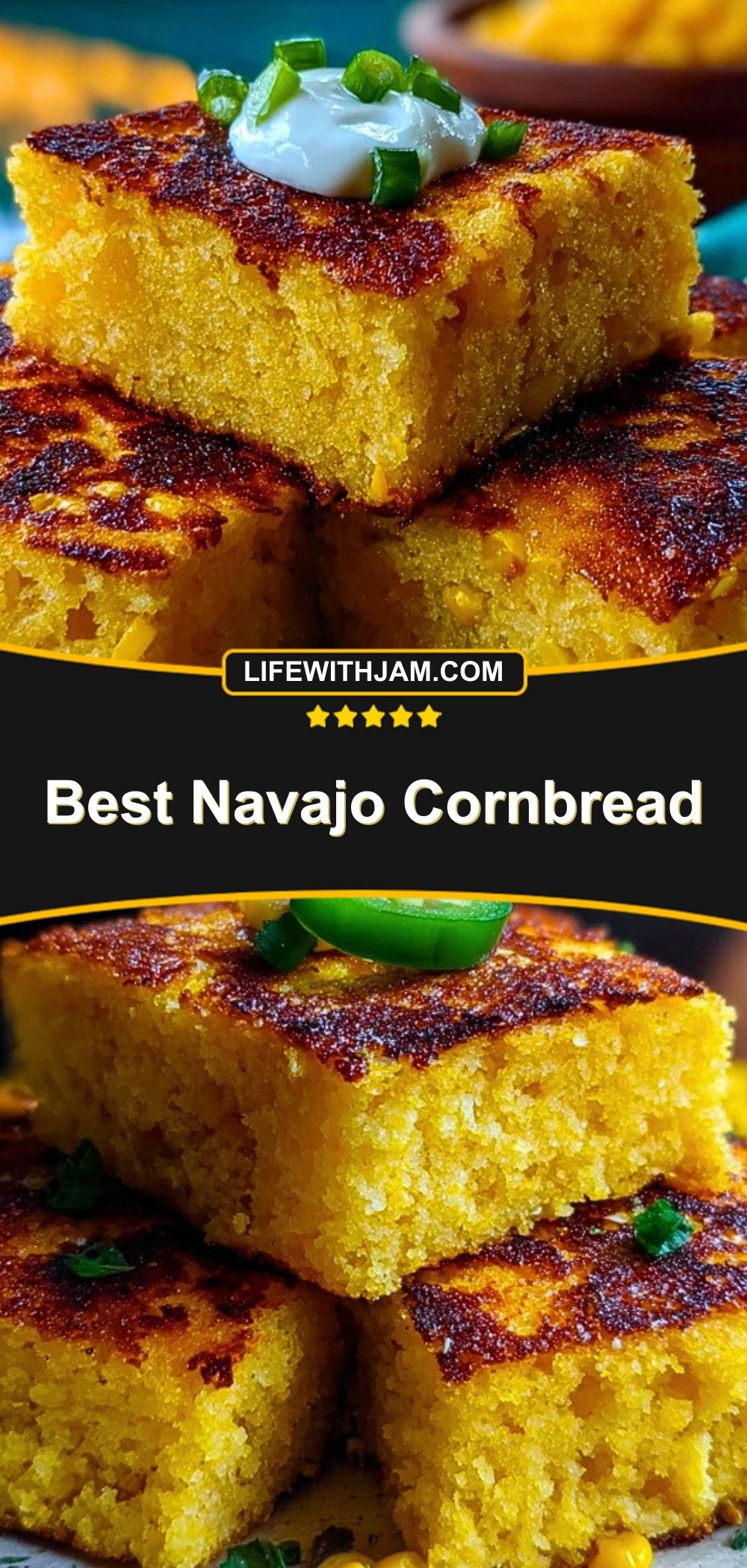 Let the cornbread rest for 5-10 minutes. Slice into squares and garnish with chopped green onions or jalapeños if desired. Serve warm.