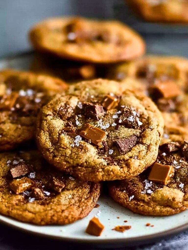 These Brown Butter Toffee Cookies are rich, chewy, and packed with nutty brown butter flavor, melty chocolate chunks, and crunchy toffee bits. Finished with flaky sea salt, they strike the perfect balance between sweet and salty. Ideal for holiday trays or everyday indulgence.