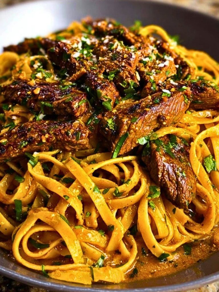 The beauty of this recipe is that it’s both impressive and uncomplicated. Whether you’re hosting or just need something indulgent after a long day, this dish hits the mark. It’s hearty without being too heavy, spicy without being overwhelming, and every forkful is layered with textures—from juicy strips of beef to slippery pasta coated in golden, spiced butter.