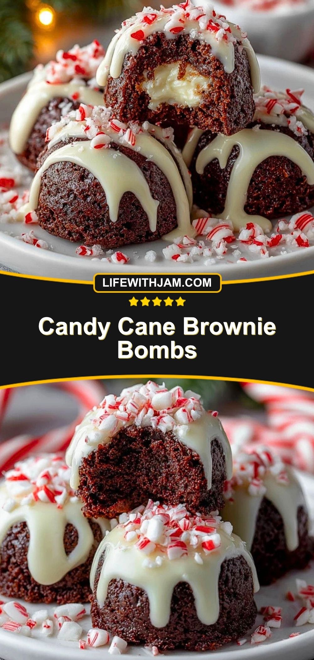 Candy Cane Brownie Bombs are best served slightly chilled or at cool room temperature, which keeps the center creamy and the coating neat. They make a beautiful addition to cookie trays, Christmas dessert boards, edible gift boxes, or after-dinner holiday sweets.