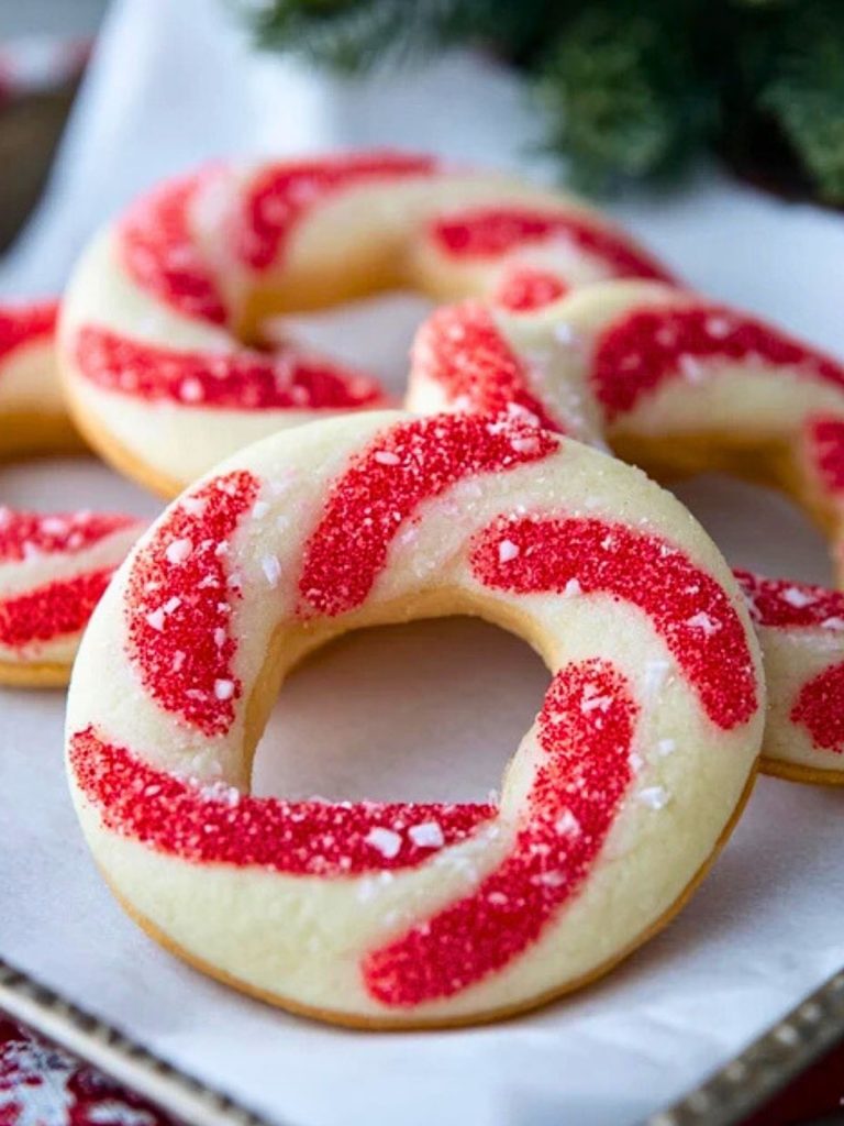 These Candy Cane Cookies are as festive as they are fun to make. With a crisp, buttery sugar cookie base and a swirl of sparkling red sugar, they resemble classic holiday peppermint sticks but in a soft, buttery ring form. Their delicate crunch and sweet vanilla flavor make them a hit at cookie swaps and perfect for gifting.