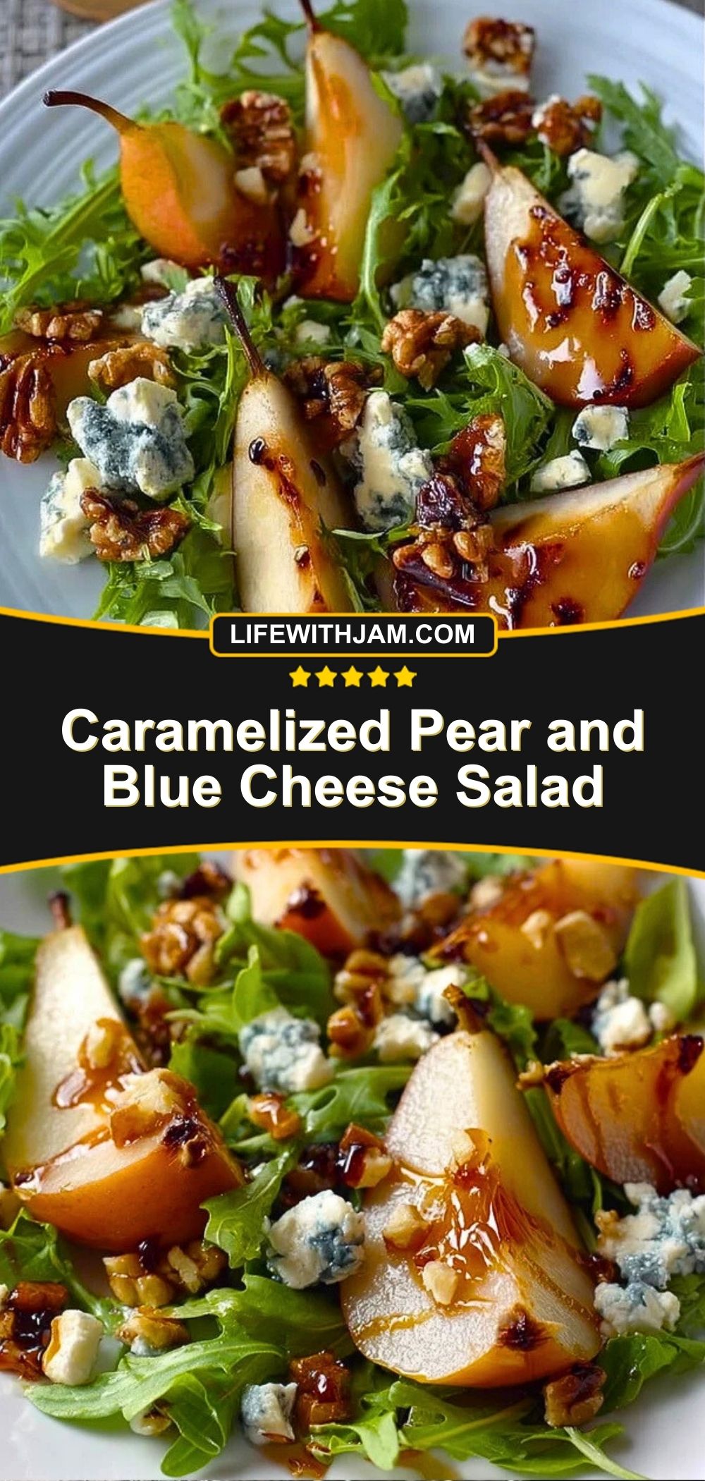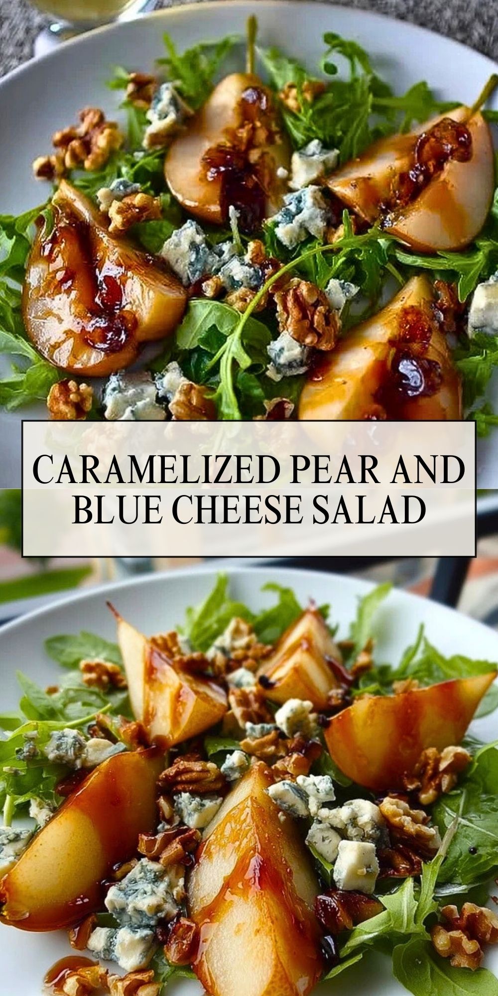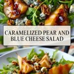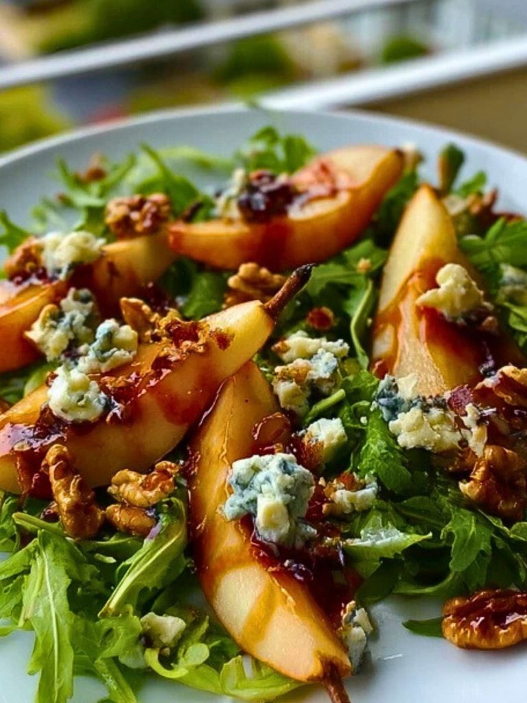 A crisp and elegant salad that blends caramelized pears, bold blue cheese, and peppery arugula with toasted walnuts and a sweet balsamic drizzle. Perfect for fall dinners, brunches, or a light meal with flair.