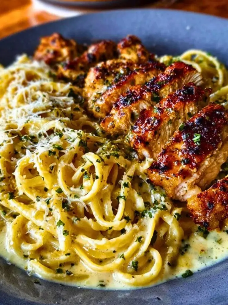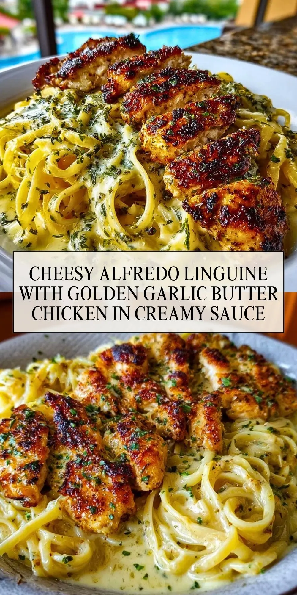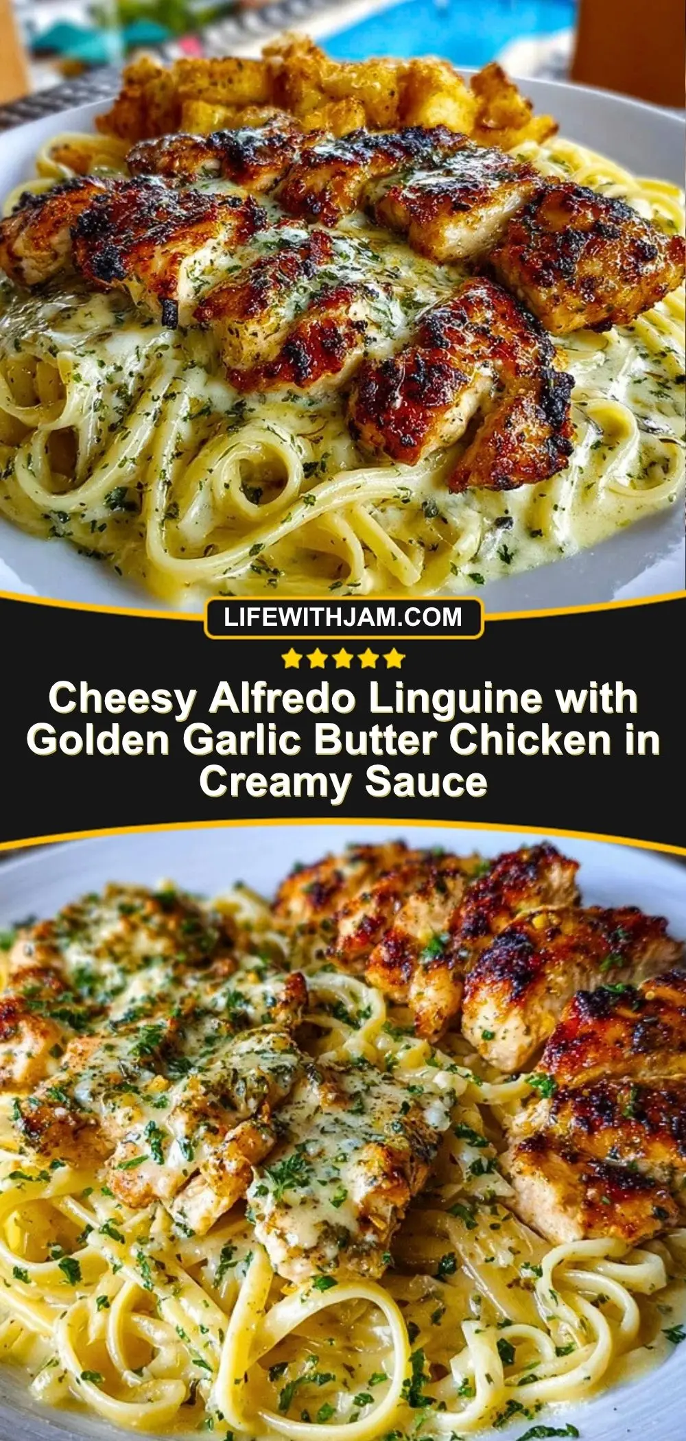 Cheesy Alfredo Linguine with Golden Garlic Butter Chicken in Creamy Sauce