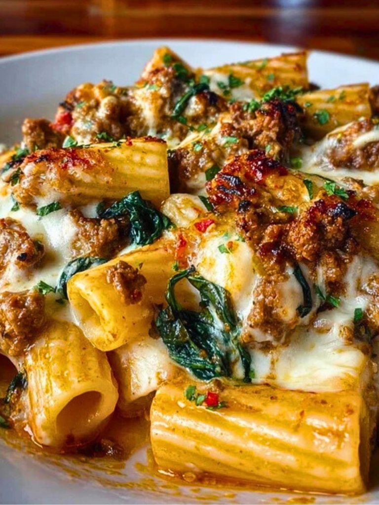 Rich, hearty, and incredibly cheesy, this Cheesy Beef and Italian Sausage Rigatoni in Garlic Butter Sauce is the ultimate comfort meal. Loaded with ground beef, savory sausage, a velvety garlic butter cream sauce, and bubbling layers of mozzarella and Parmesan, it’s a weeknight dinner that feels like a special occasion.