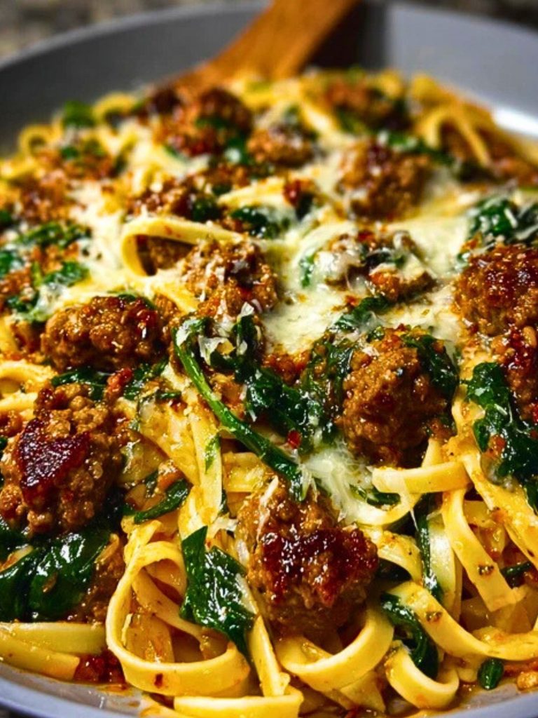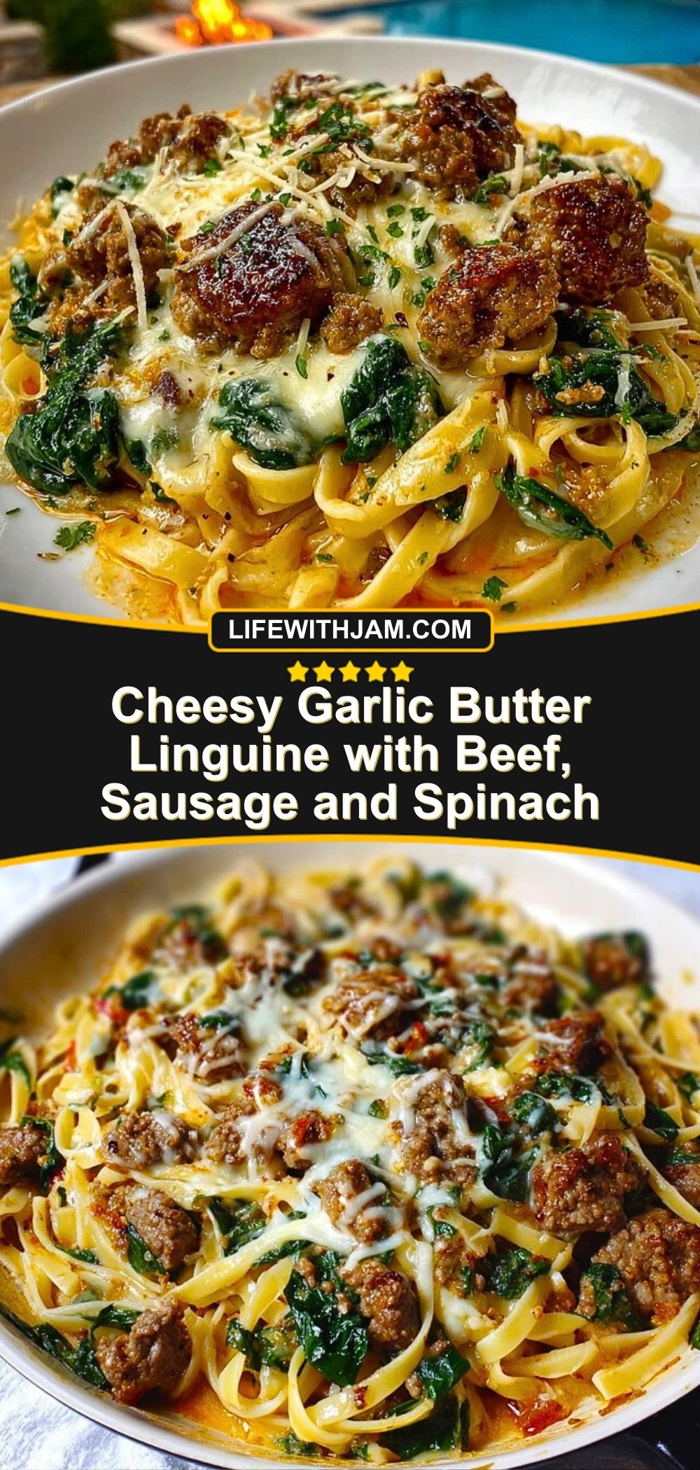 This Cheesy Garlic Butter Linguine with Beef, Sausage and Spinach is a creamy, savory pasta dish that brings big flavor and comfort to your table. Loaded with ground beef, Italian sausage, melty cheese, and fresh spinach—all wrapped in a garlic butter cream sauce—it’s a quick and indulgent dinner that’s ready in under 30 minutes.