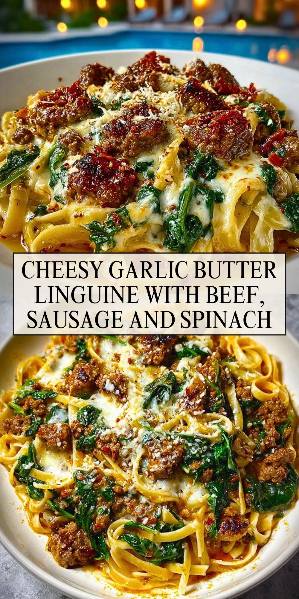 Creamy, rich, and bursting with savory goodness, this Cheesy Garlic Butter Linguine with Beef, Sausage and Spinach is the ultimate comfort food for your weeknight table. It combines tender linguine noodles with a buttery garlic sauce, savory sausage and beef, wilted spinach, and gooey melted cheese—all wrapped together with a slight kick of spice. The flavors meld into something so satisfying, you’ll be licking the plate clean.