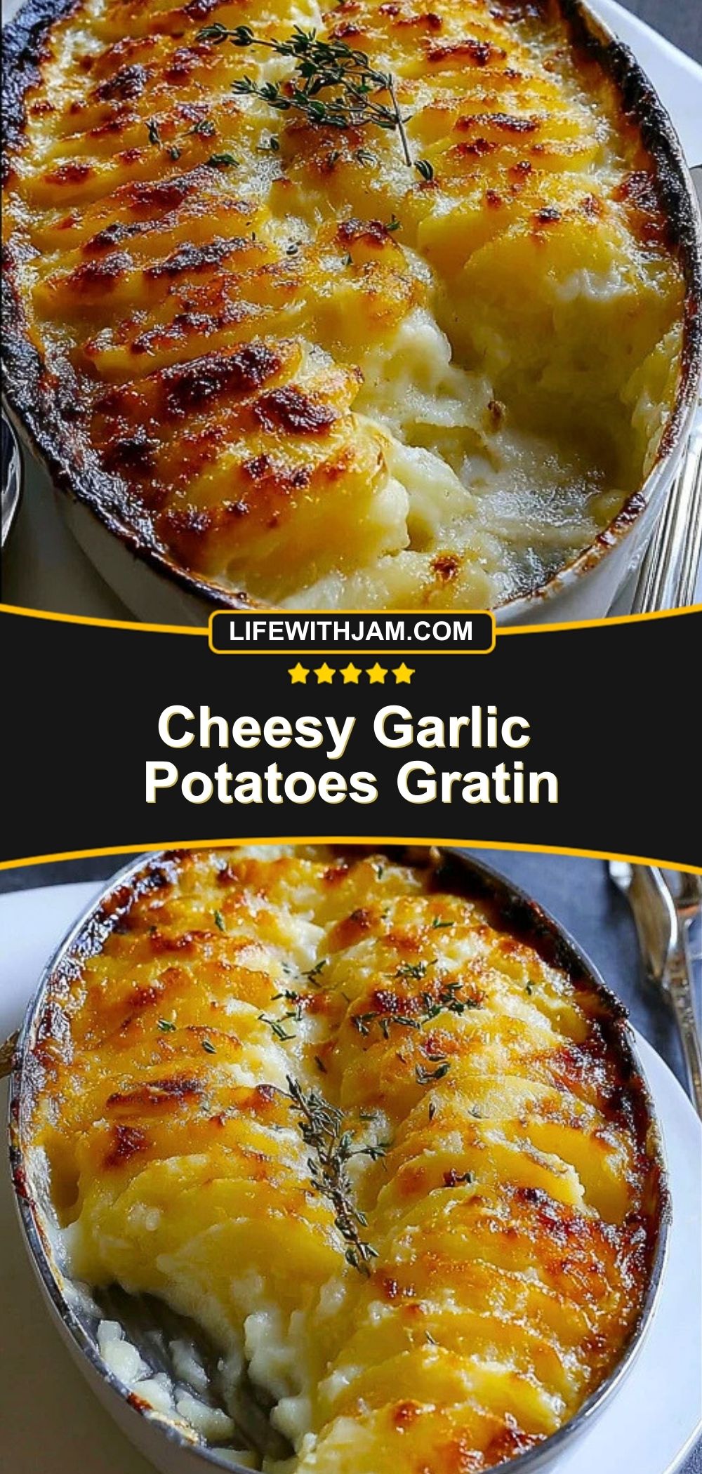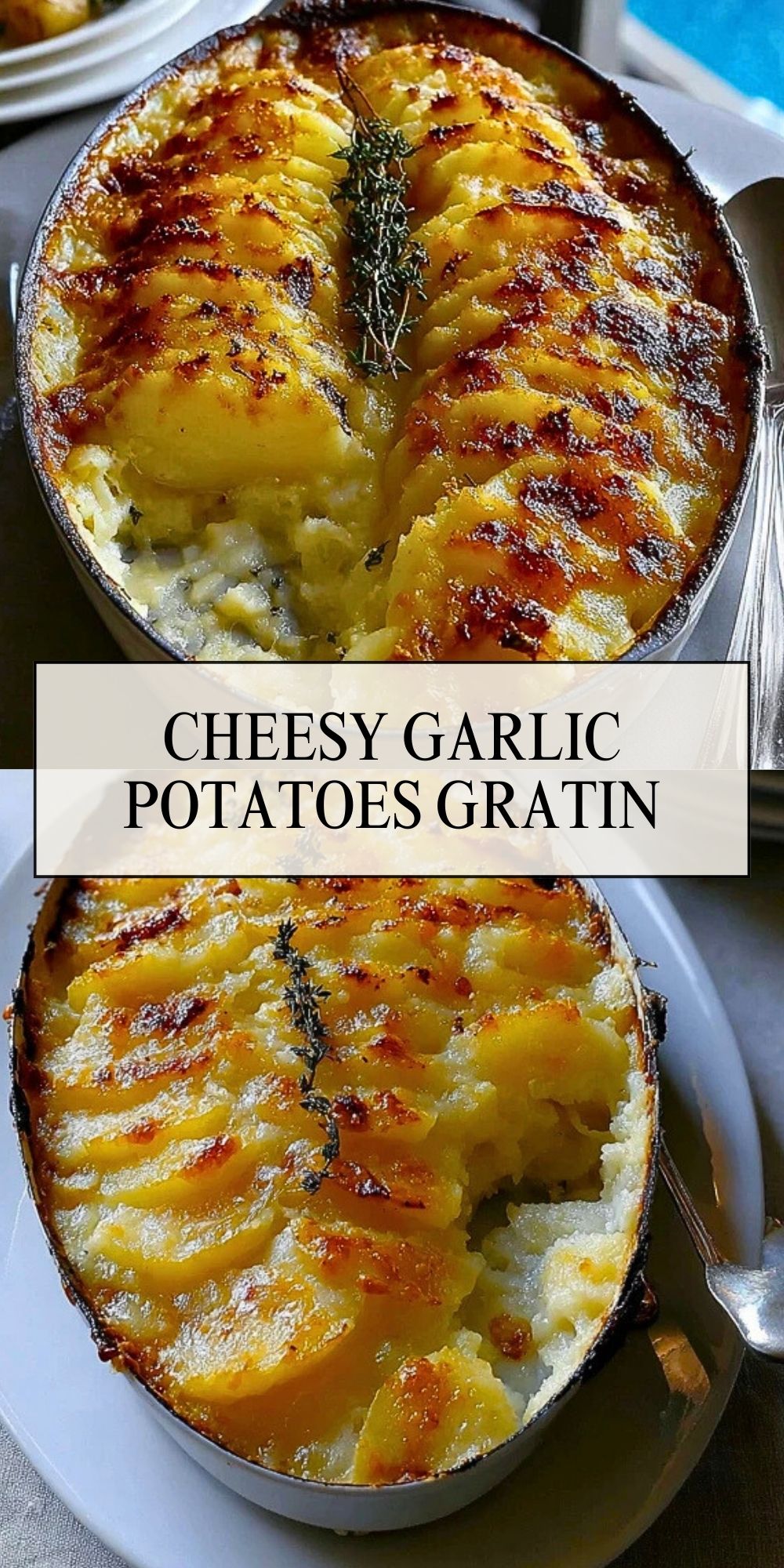 Cheesy Garlic Potatoes Gratin is the ultimate comfort food side dish—layers of tender Yukon Gold potatoes, garlic-infused cream, and a rich blend of Gruyère and Parmesan cheese baked until bubbly and golden. Whether it’s for a cozy family dinner or a special occasion, this creamy gratin is always a crowd-pleaser.