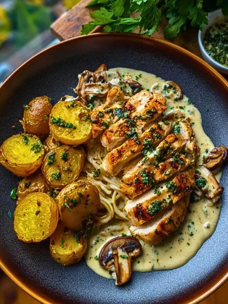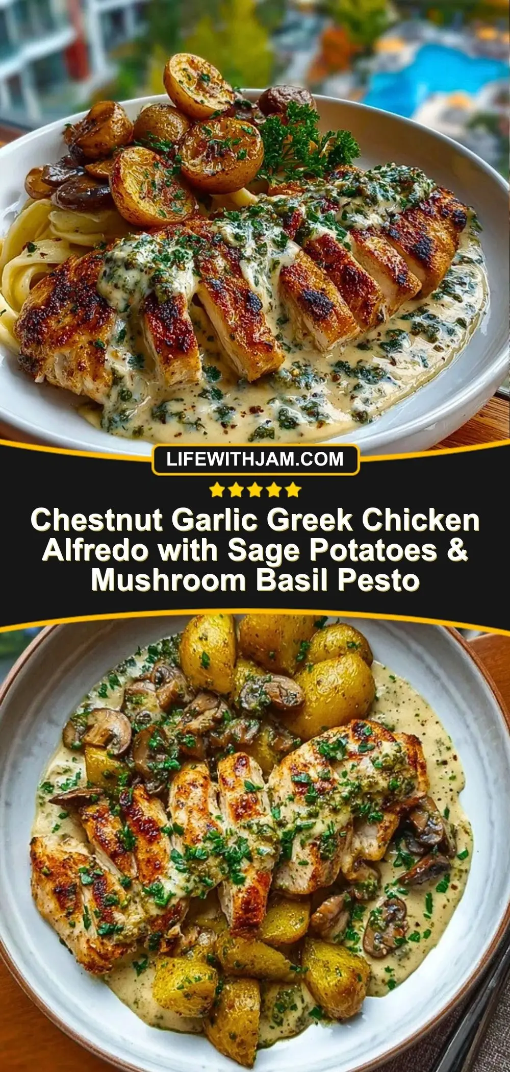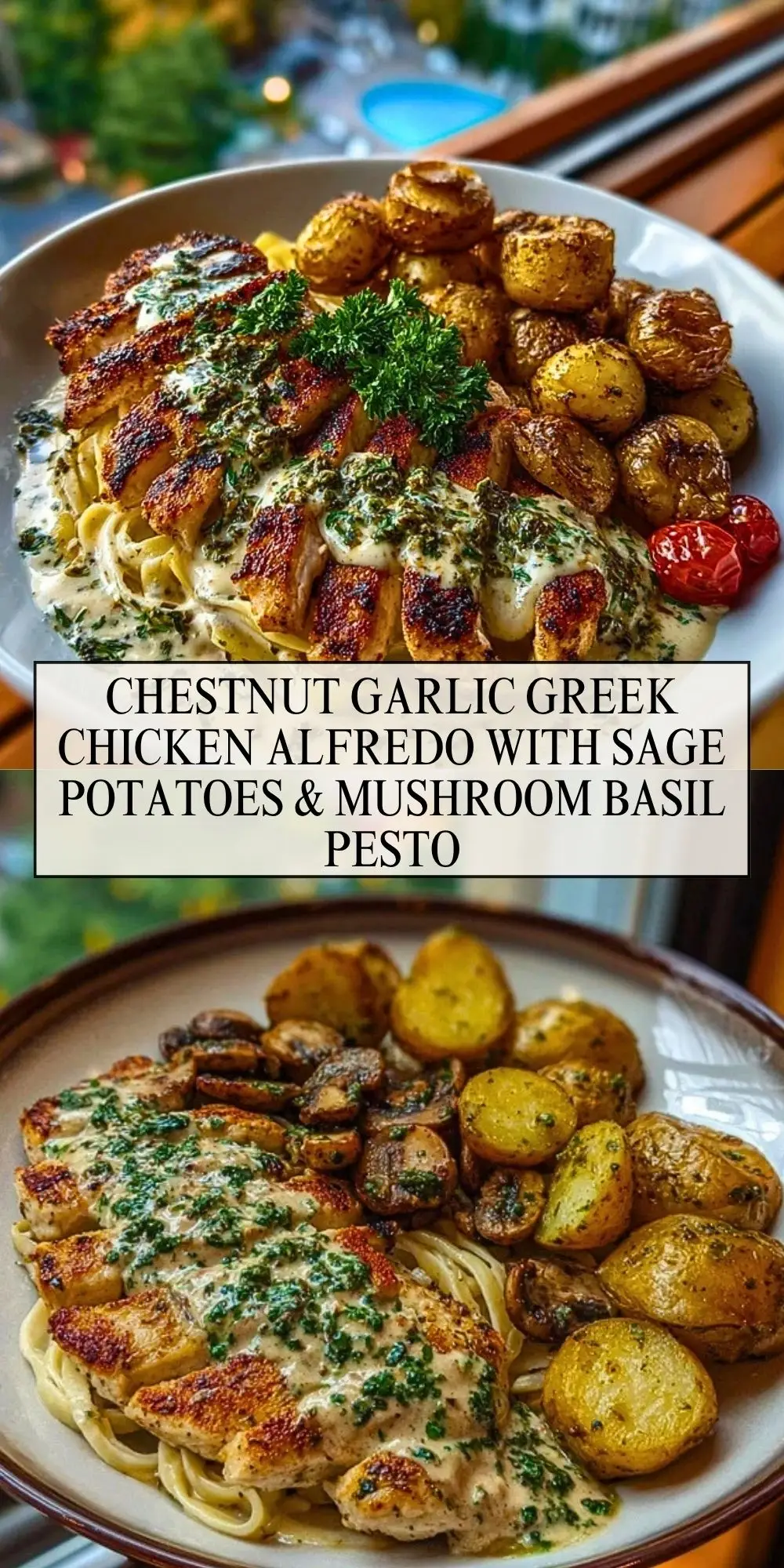 Creamy, aromatic, and layered with rich flavors, this Chestnut Garlic Greek Chicken Alfredo takes comfort food to new heights. Imagine juicy, pan-seared chicken bathed in velvety Alfredo sauce infused with roasted chestnut and garlic notes, all paired with golden sage-roasted potatoes. The addition of a vibrant mushroom basil pesto ties the entire dish together with earthy freshness.