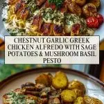 Chestnut Garlic Greek Chicken Alfredo with Sage Potatoes & Mushroom Basil Pesto