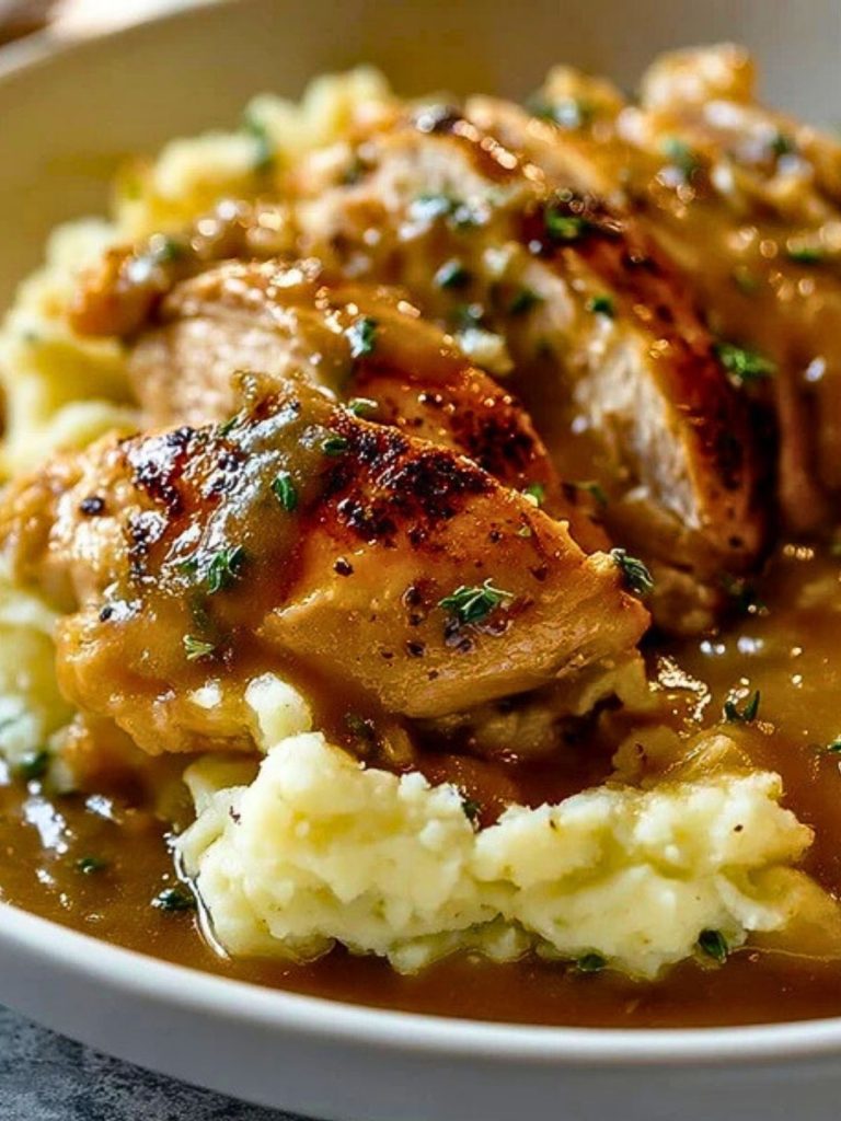 Golden seared chicken breasts served over creamy, cheesy mashed potatoes and drenched in rich garlic gravy. This comforting, flavorful dinner is a go-to for cozy nights and special weekends alike.