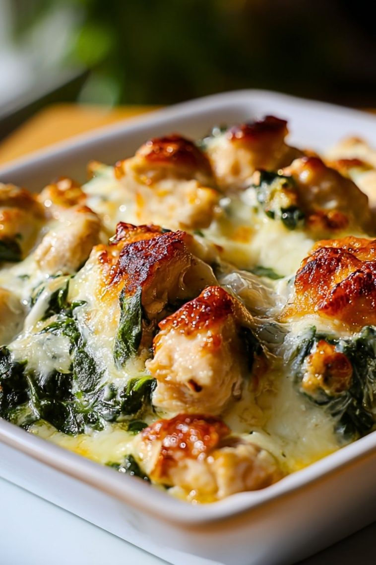 A creamy, cheesy baked casserole featuring tender chunks of chicken, spinach, and a luscious cream cheese sauce. This comforting dish is topped with golden, bubbly cheese and is perfect for family dinners or prepping meals ahead.