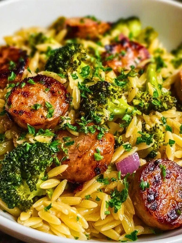 This easy, one-pan Chicken Sausage and Broccoli Orzo is a flavorful weeknight dinner that comes together in under 30 minutes. Creamy orzo, smoky sausage, and crisp broccoli make this a comforting and nutritious meal.