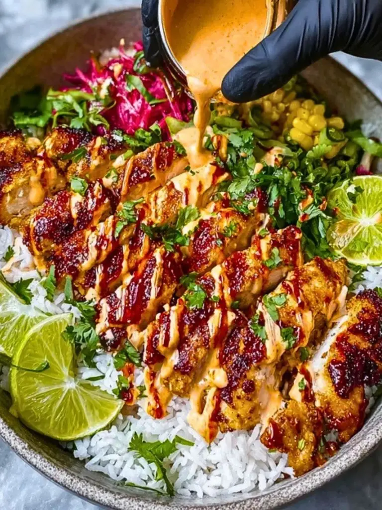 Smoky, spicy, creamy, and fresh—this Chili Chicken Bowl with Coconut Lime Drizzle is the kind of dish that wakes up all your senses. The char-grilled chicken is kissed with chili heat and paired with fluffy white rice, while the drizzle of coconut milk, lime, and a hint of sweetness cools everything down in the most luxurious way. Every bite is a perfect balance of zingy citrus and rich, savory depth.