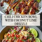 Keywords: chili chicken bowl, coconut lime drizzle, healthy dinner, spicy chicken, rice bowl