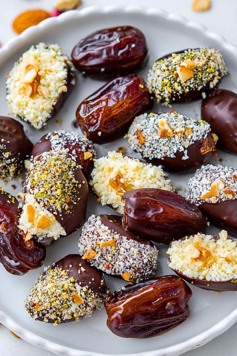 Dip each chilled date halfway into the melted chocolate. Let the excess drip off, then place on a parchment-lined tray. Sprinkle with chopped nuts or shredded coconut while the chocolate is still wet.