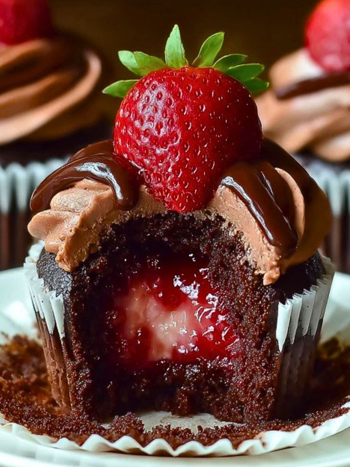 Pipe chocolate frosting over the filled cupcakes. Top each with a whole strawberry and a drizzle of melted chocolate.