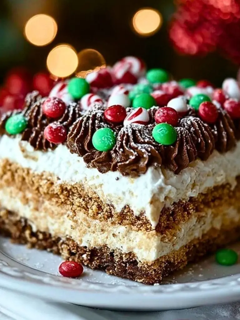 Each bite delivers creamy, crunchy, chocolatey joy and a generous sprinkle of nostalgia. It’s topped with crushed peppermint candies and red and green M&Ms for that cheerful touch that practically shouts Christmas. No oven needed, which makes this perfect for holiday bakers of any skill level. Just chill, layer, and serve.