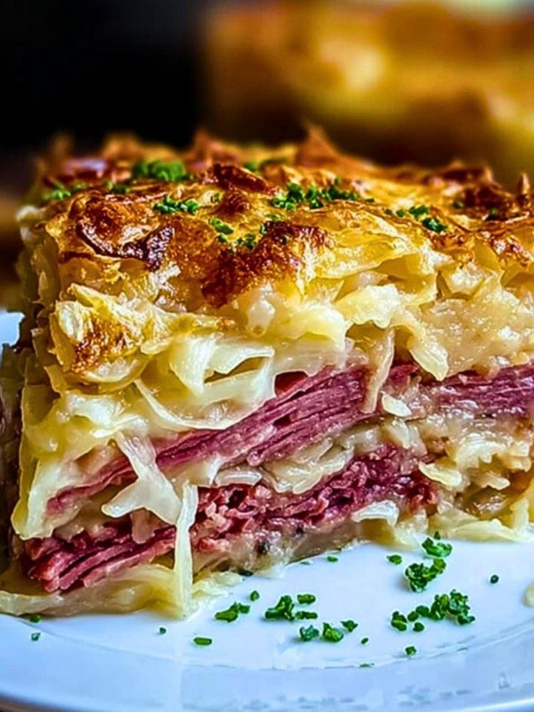 Perfect for potlucks, weekend dinners, or St. Patrick’s Day celebrations, this bake is both nostalgic and indulgent. The golden crust crisps up beautifully on top while the inside stays gooey, savory, and full of texture. It’s like your favorite deli sandwich took a cozy, cheesy nap in the oven — and woke up irresistible.
