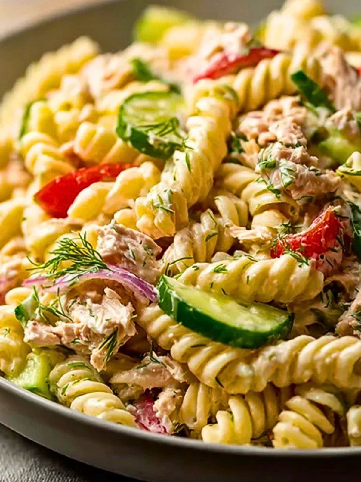 This is the sort of dish that works for lunch meal prep, summer gatherings, easy dinners, and potluck tables. It feels hearty enough to stand on its own, but it also pairs beautifully with sandwiches, grilled meats, or fruit on the side. The combination of cool pasta, crunchy cucumber, juicy tomatoes, and savory tuna gives every bite plenty of texture and flavor.
