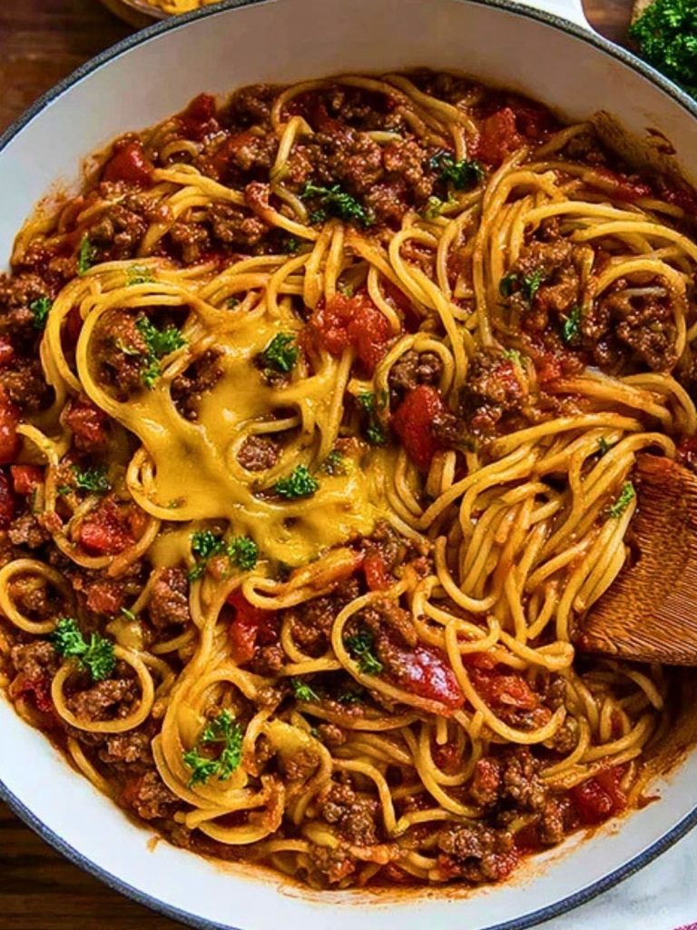 Cowboy Spaghetti is a smoky, cheesy, comfort-filled twist on the classic pasta dinner. With crisp bacon, seasoned beef, a BBQ-spiked tomato sauce, and gooey cheddar melted on top, it’s a one-pan wonder that’ll have everyone going back for seconds.