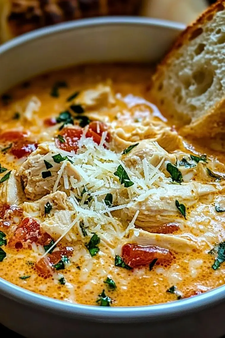 The soup is rich but not overwhelming, making it an easy weeknight dinner option or a showstopper for a cozy weekend gathering. With seasoned chicken, Italian herbs, and a cheesy swirl of cream and Parmesan, this soup hits every note just right. A final sprinkle of fresh parsley and shredded cheese takes it straight over the top.