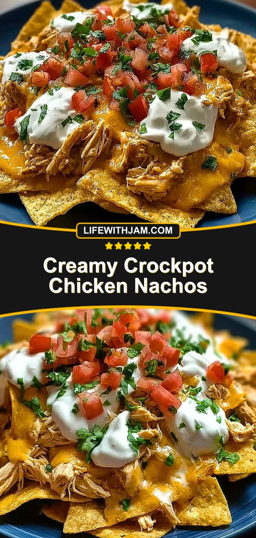 Creamy Crockpot Chicken Nachos are best enjoyed hot and fresh, right after assembly. Serve with extra toppings on the side for a build-your-own nacho bar feel.