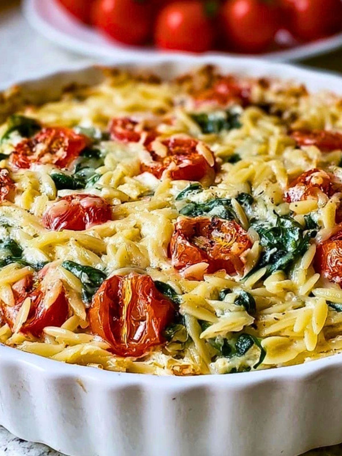 In a 9×13″ baking dish or deep pie dish, add the dry orzo, sautéed garlic and spinach, halved cherry tomatoes, Boursin cheese (break it into chunks), mozzarella, and Parmesan. Sprinkle in oregano, salt, and pepper.