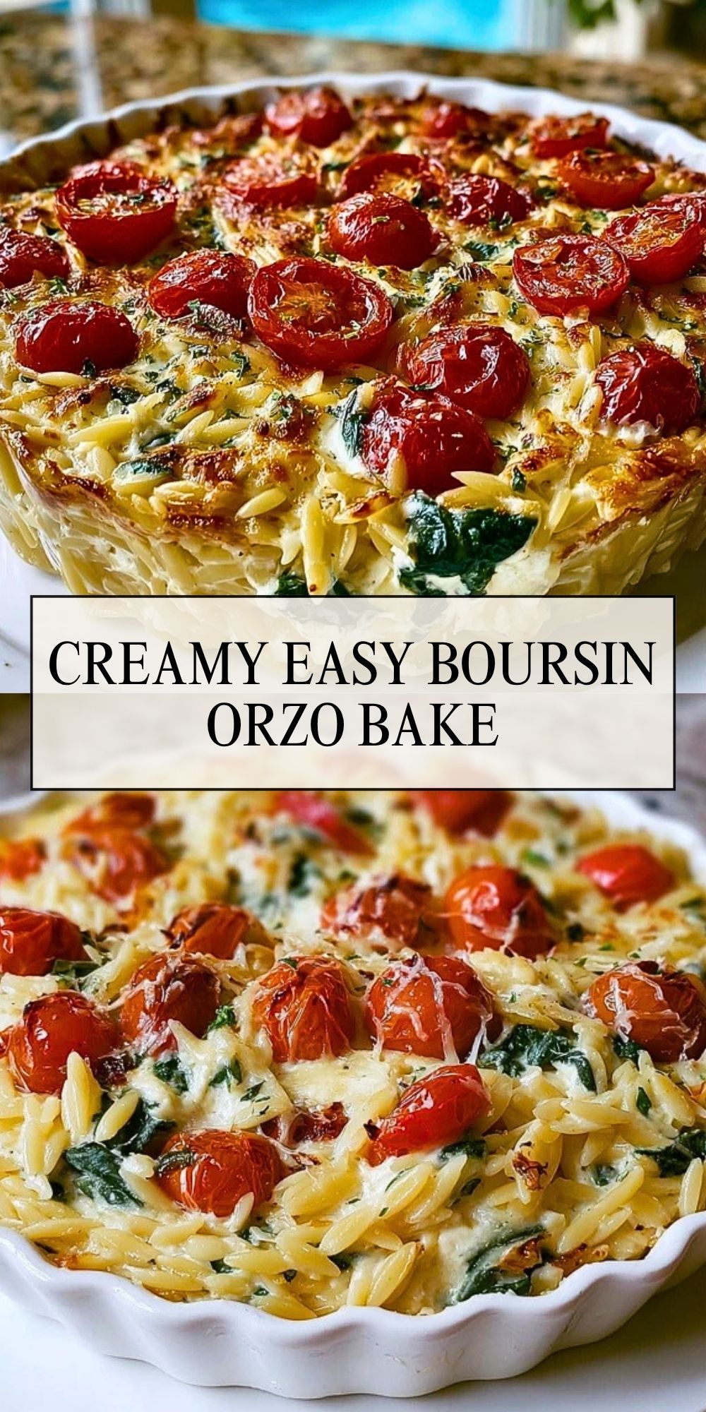 Creamy, cozy, and packed with flavor, this Boursin Orzo Bake is your new weeknight hero. Imagine creamy herbed cheese melting into tender orzo pasta, balanced with juicy roasted cherry tomatoes and sautéed spinach for a pop of freshness. It’s all baked together into a golden, bubbling casserole that tastes like comfort in every bite.