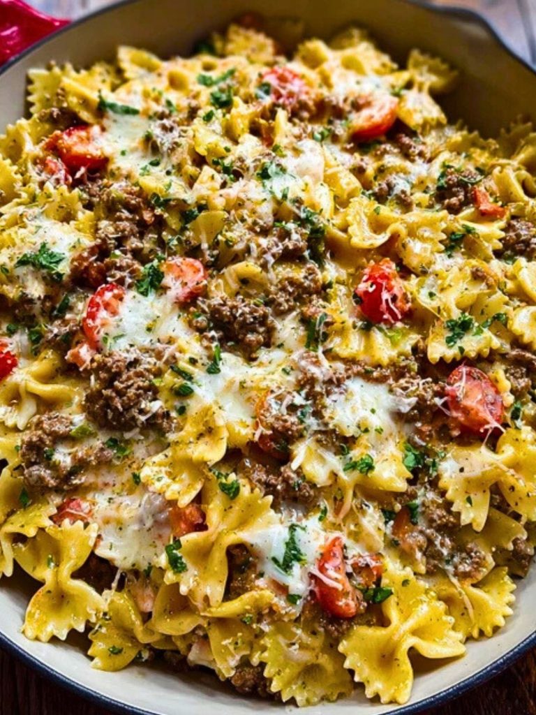 A cozy, cheesy skillet pasta with seasoned ground beef, farfalle pasta, and a rich cream sauce blended with melty mozzarella and sharp parmesan. It’s quick, hearty, and always a crowd-pleaser!