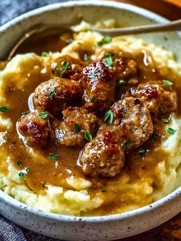 The magic starts with slow-roasted garlic, mellow and caramelized, whipped into buttery mashed potatoes. Then comes the gravy—sizzling sausage browned to perfection, simmered with aromatics and thickened into a rich sauce. Each spoonful delivers depth and decadence, the kind of homemade taste that makes you go back for seconds (or thirds).