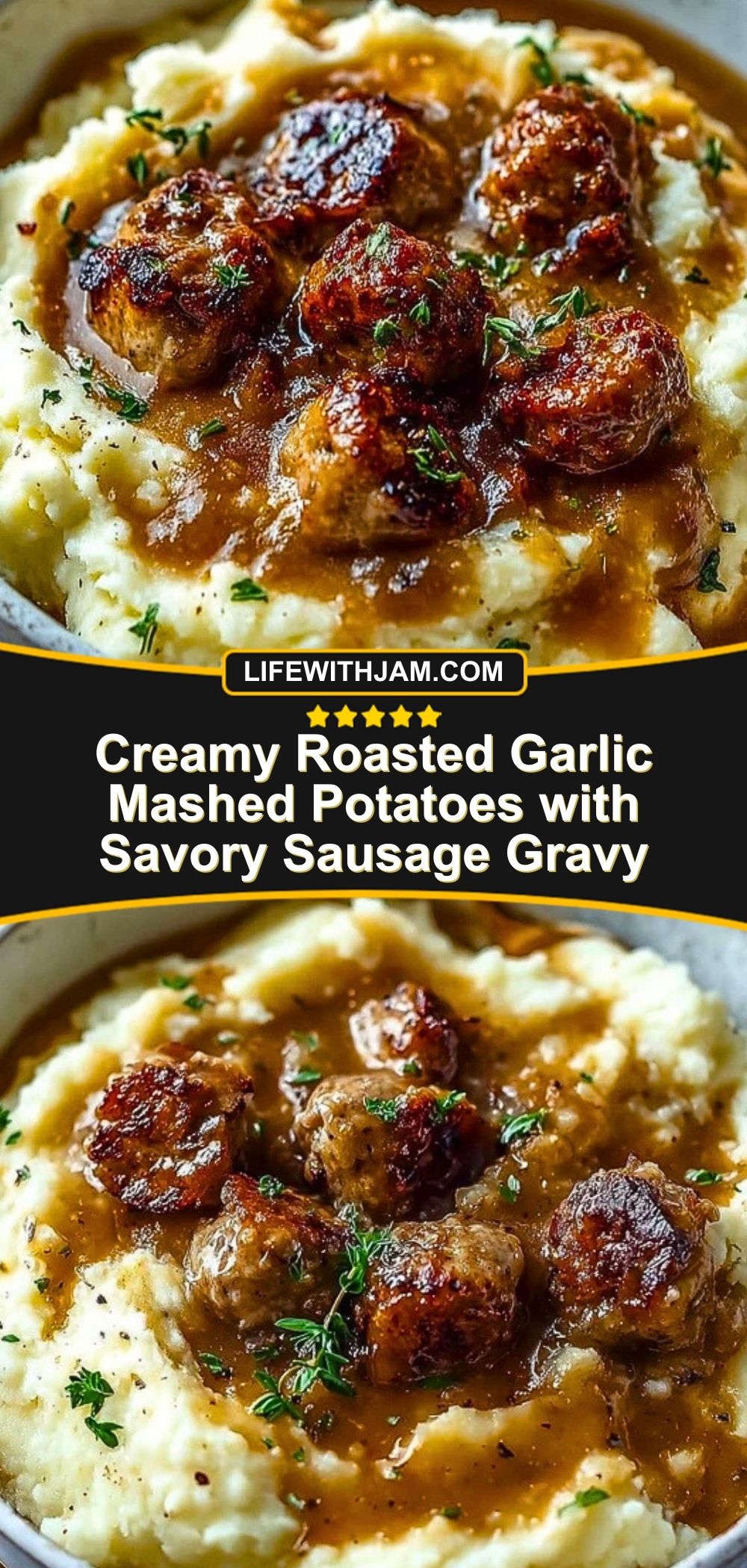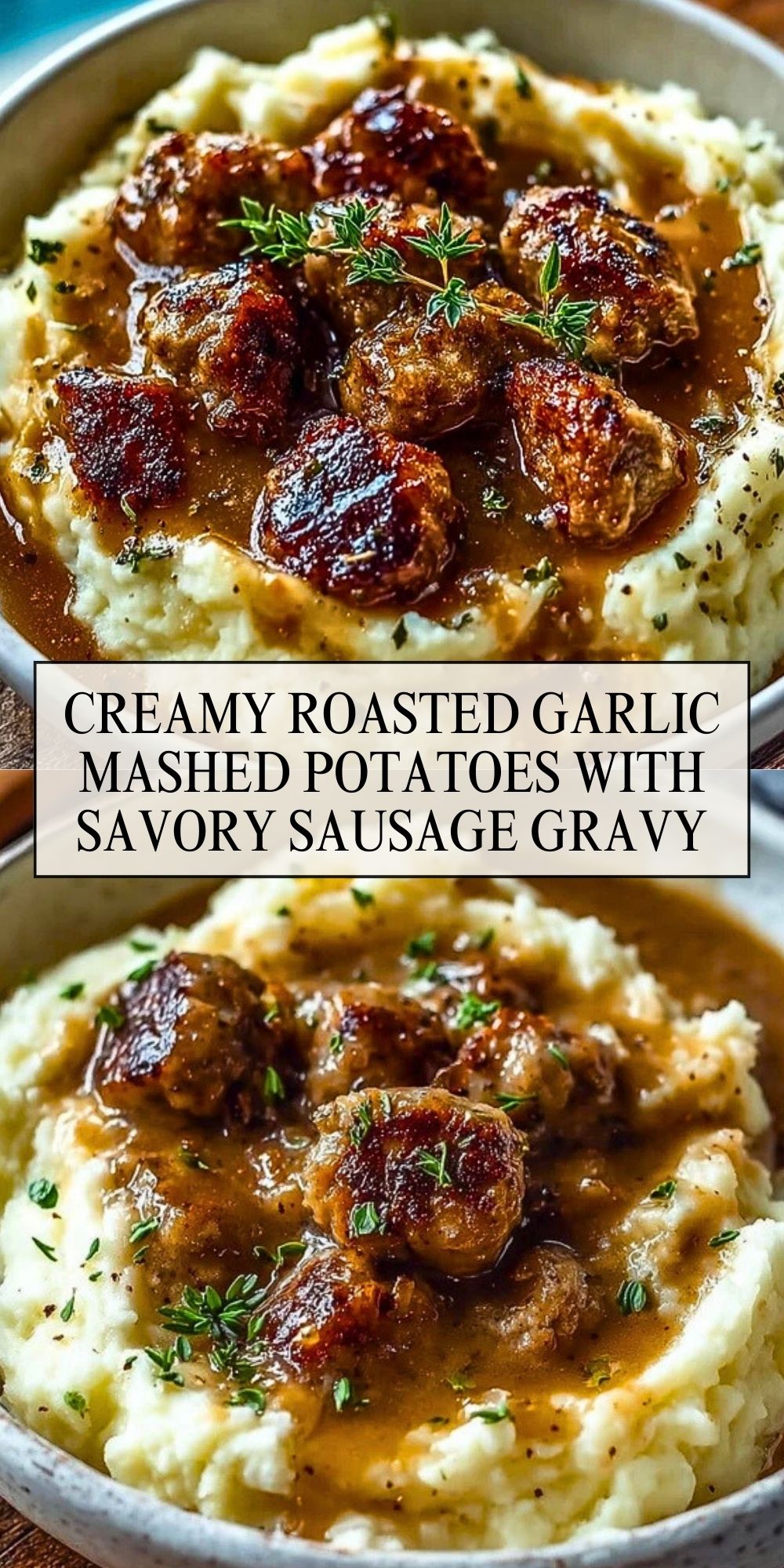 Creamy Roasted Garlic Mashed Potatoes with Savory Sausage Gravy