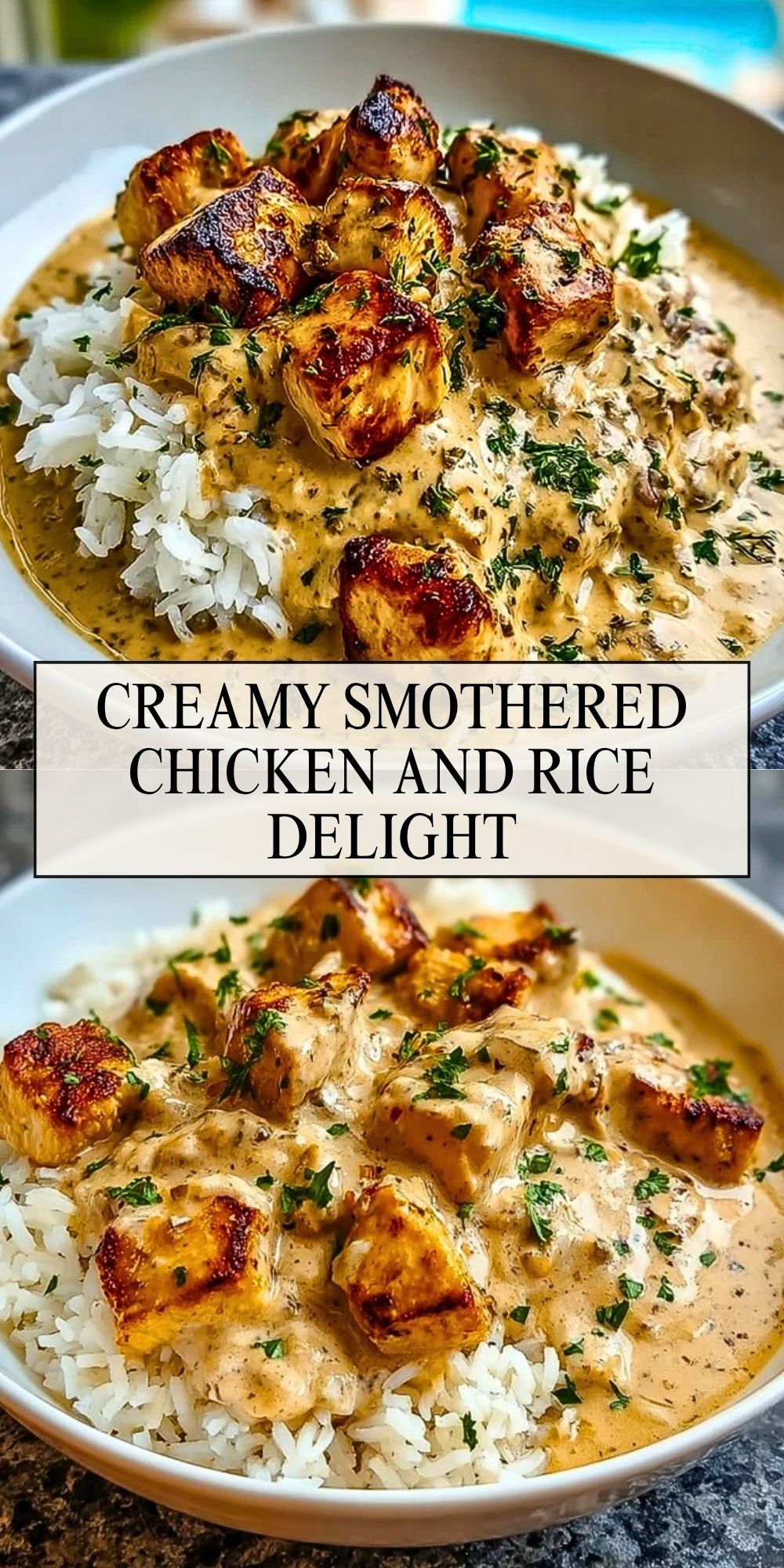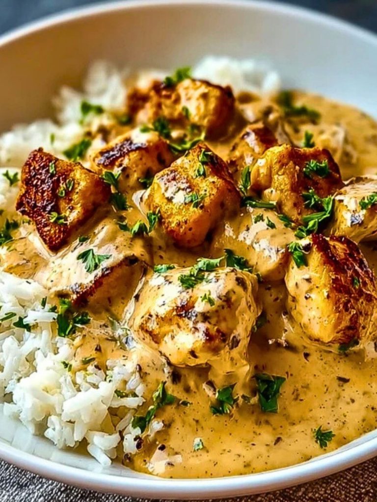 Creamy Smothered Chicken and Rice Delight is the ultimate comfort meal made with golden-seared chicken bites simmered in a rich herb cream sauce. Poured over fluffy white rice, it’s hearty, flavorful, and ready in under 30 minutes. Perfect for weeknights, cozy family dinners, or whenever you’re craving a soul-warming dish.
