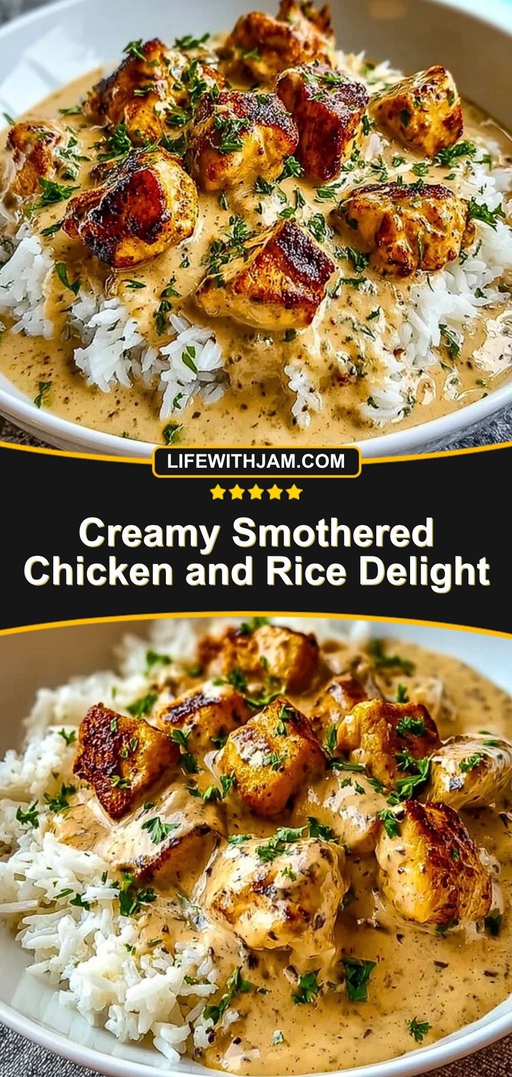 Golden-seared chicken bites, simmered in a luscious herb cream sauce, poured over fluffy white rice. Creamy Smothered Chicken and Rice Delight is the ultimate comfort food dish that wraps you up in warmth and flavor. This is a go-to dinner when you want something hearty yet simple—ready in just about 30 minutes, it’s a weeknight dream.