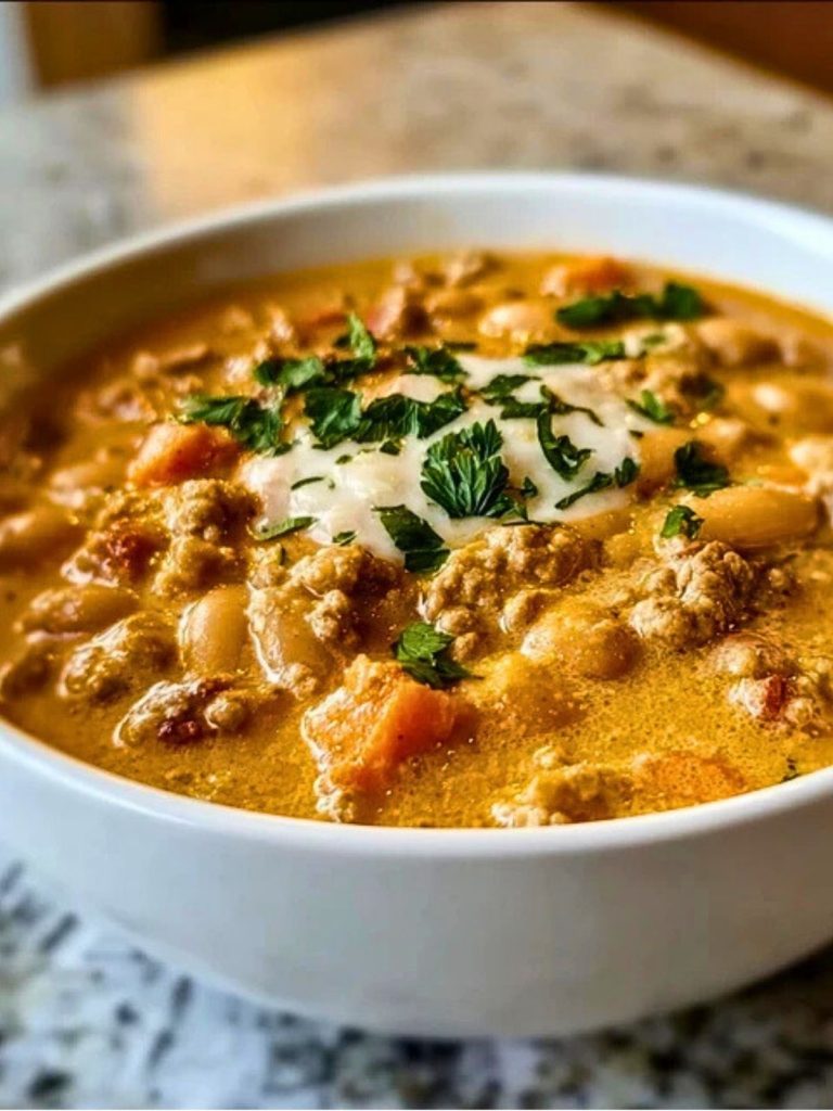 It’s not your average chili. The pumpkin lends a subtle sweetness and velvety texture, while smoky paprika, garlic, and a touch of cream balance everything out. With every bite, you’ll get chunks of tender turkey, creamy white beans, and a hint of autumn spice—like a warm hug in a bowl.