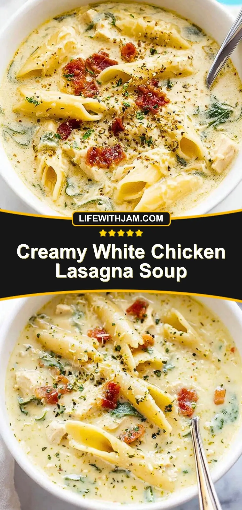 If your favorite comfort foods were to marry, this Creamy White Chicken Lasagna Soup would be the delicious result. Imagine everything you love about a cozy lasagna layered with creamy white sauce, hearty shredded chicken, tender pasta, and bits of smoky bacon — all swirling in one soul-warming bowl.