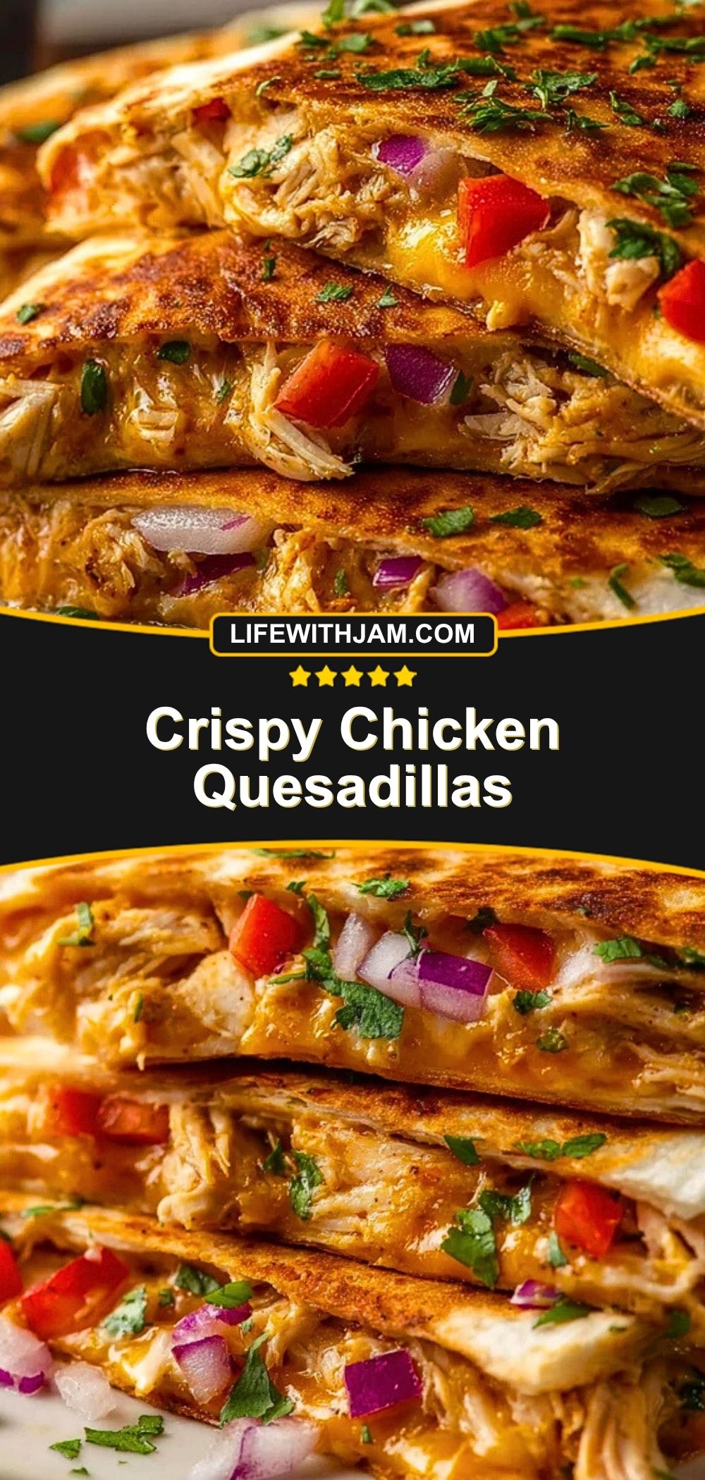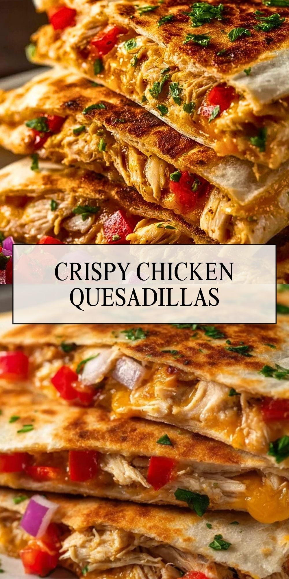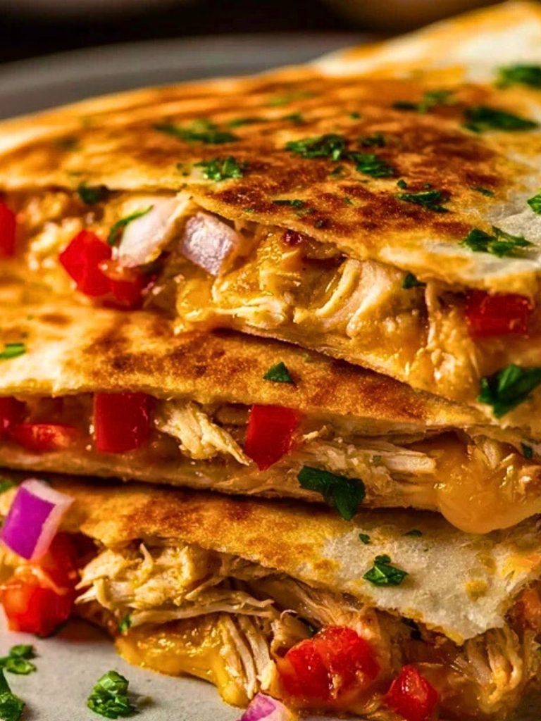 These Crispy Chicken Quesadillas are packed with shredded chicken, melty cheese, sautéed veggies, and bold taco flavor—all folded into golden tortillas with an irresistible crunch. Perfect for a quick lunch, dinner, or game-day snack!