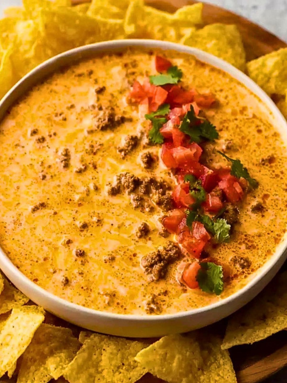 Top with chopped tomatoes, cilantro, or jalapeños if desired. Serve warm with chips.