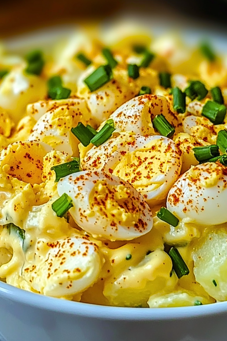 What sets this dish apart is the texture and boldness. The creaminess of the yolk-mayo-mustard mixture coats tender potatoes perfectly, while the sliced hard-boiled eggs give you that signature deviled egg bite. Whether served cold or just slightly warm, it’s comfort food that feels elevated without being fussy.