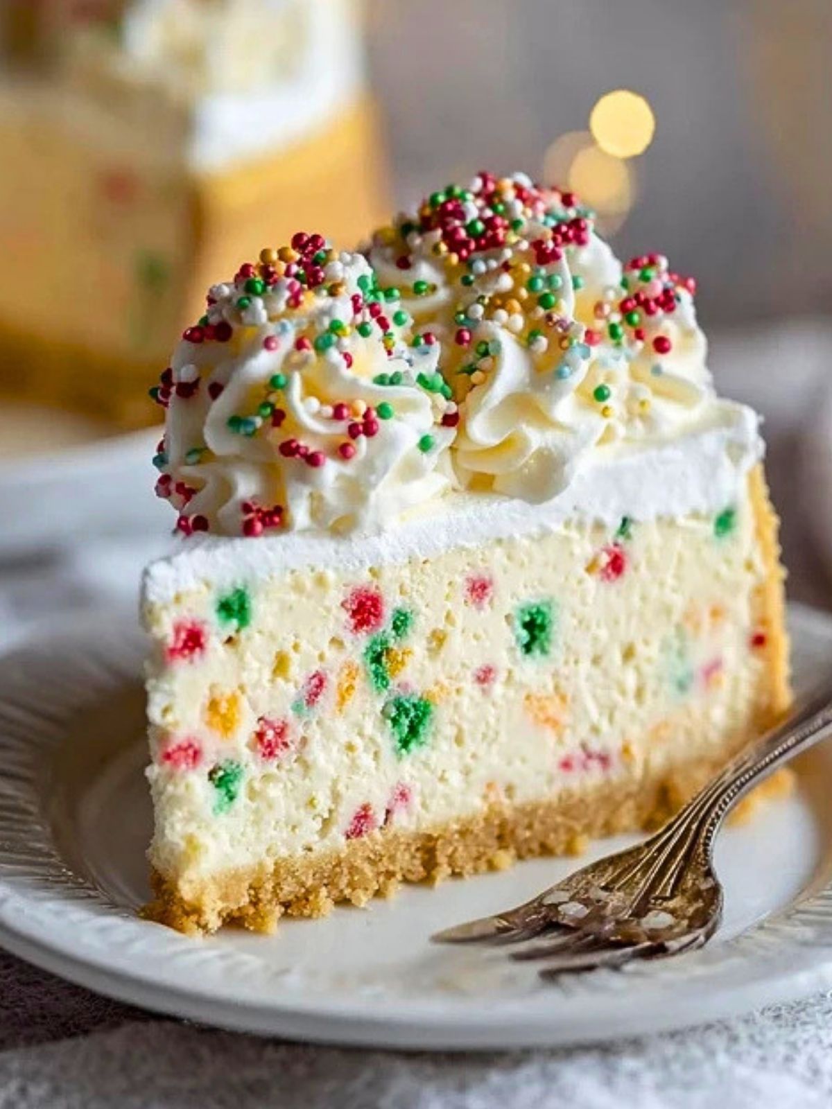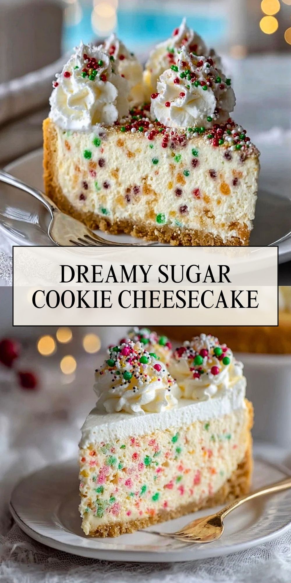 With its smooth vanilla cheesecake filling, colorful holiday sprinkles, fluffy whipped topping, and sweet cookie-inspired flavor, this dessert is perfect for parties, cookie exchanges, birthdays, or holiday dessert tables. It is easy to dress up, simple to slice, and guaranteed to get attention the moment it hits the table.