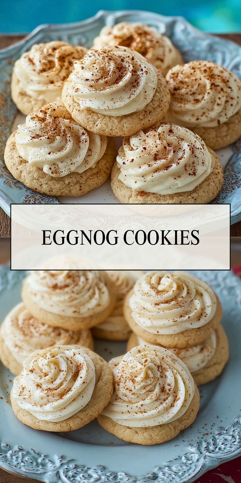 Beat the butter and cream cheese until smooth. Add the powdered sugar, vanilla, and enough eggnog to create a fluffy, pipeable frosting. Taste and add a tiny pinch of nutmeg if you want more warm spice.