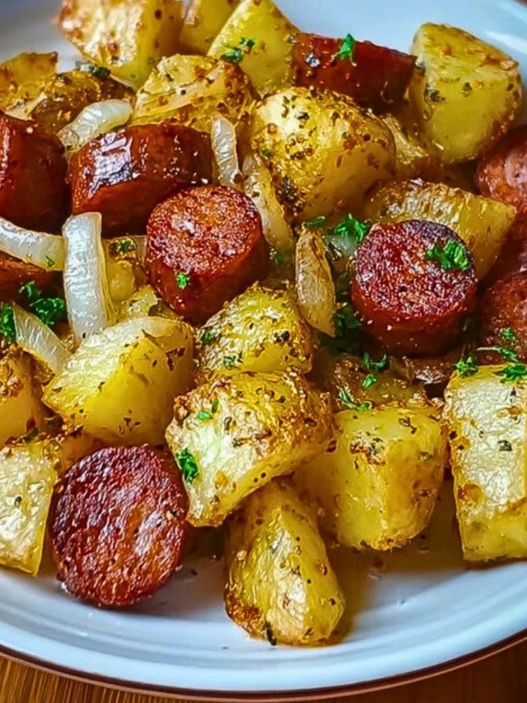 Crispy golden potatoes, tender caramelized onions, and smoky seared sausage come together in this one-pan classic. Fried Potatoes with Onions and Smoked Polish Sausage is a comforting skillet meal that’s perfect for any time of day—quick to make, deeply flavorful, and family-approved.