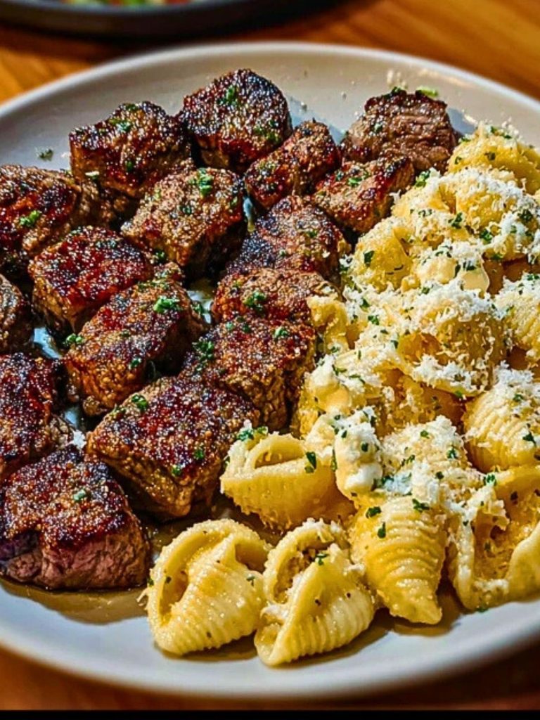 Garlic Butter Steak Bites & Creamy Parmesan Shells is the ultimate indulgent dinner with tender, seared steak bites coated in rich garlic butter and served over velvety Parmesan pasta shells. Ready in under 30 minutes, it’s a restaurant-quality dish perfect for weeknights or entertaining.