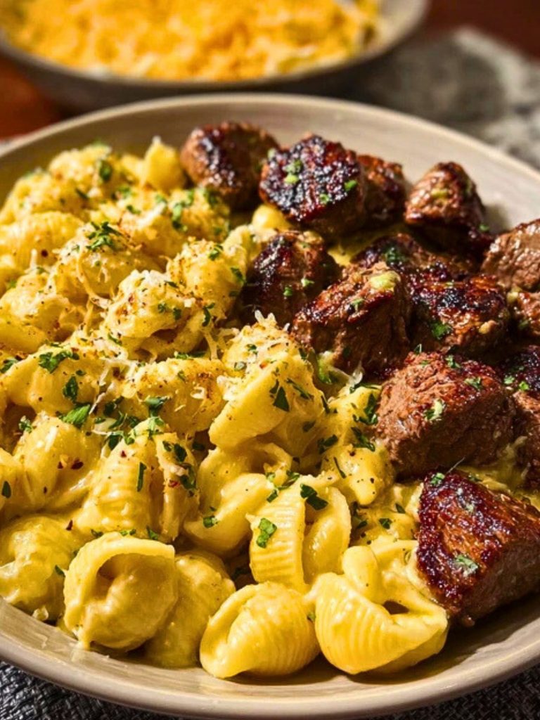 Creamy cheddar Alfredo pasta shells served alongside juicy garlic butter steak bites—this dish delivers steakhouse flavor with cozy comfort. It’s perfect for date night, family dinner, or any time you want to impress without the stress.