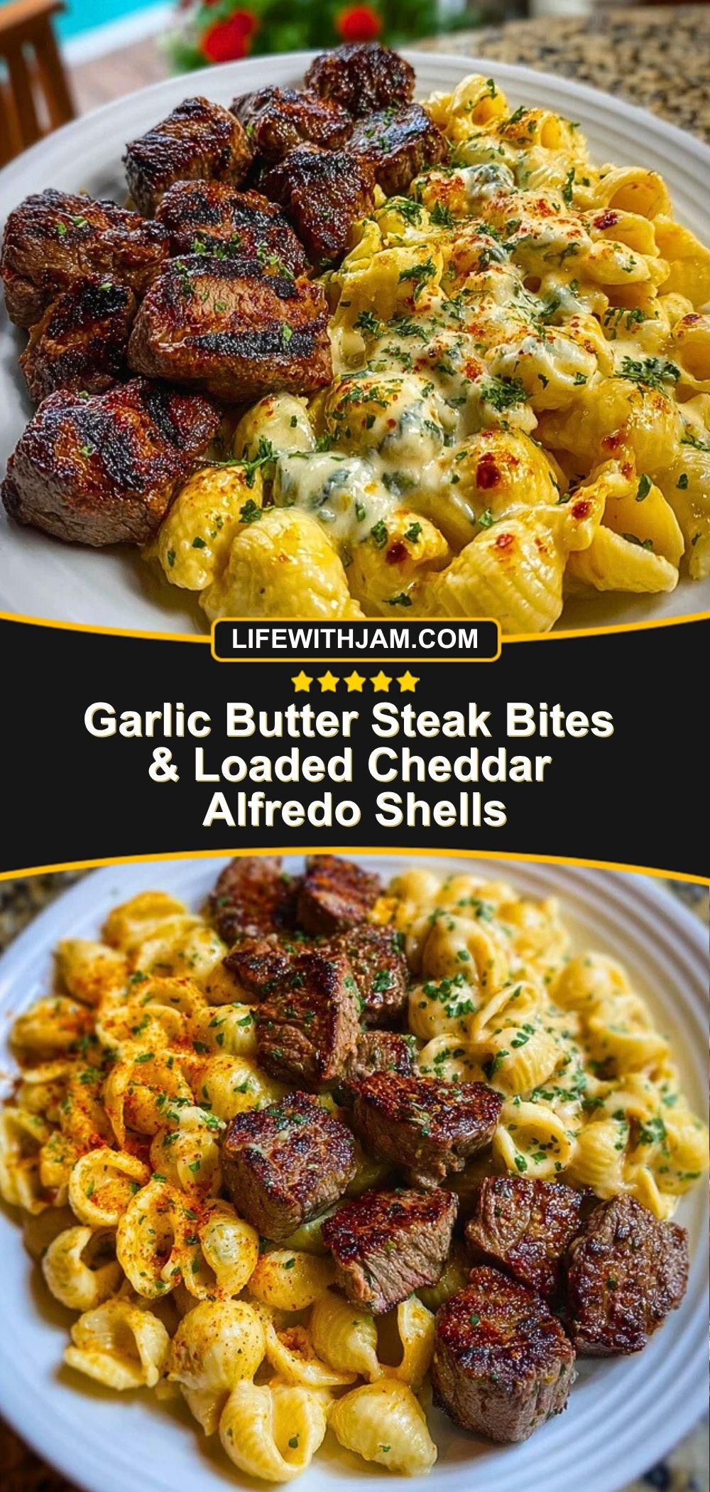 Creamy, cheesy pasta meets juicy, seared steak in this comfort-packed dinner duo. Garlic Butter Steak Bites & Loaded Cheddar Alfredo Shells is that rare recipe that manages to be indulgent, simple, and weeknight-friendly all at once. Imagine rich cheddar-coated shells served alongside tender steak bites seared to perfection in a garlic butter glaze.