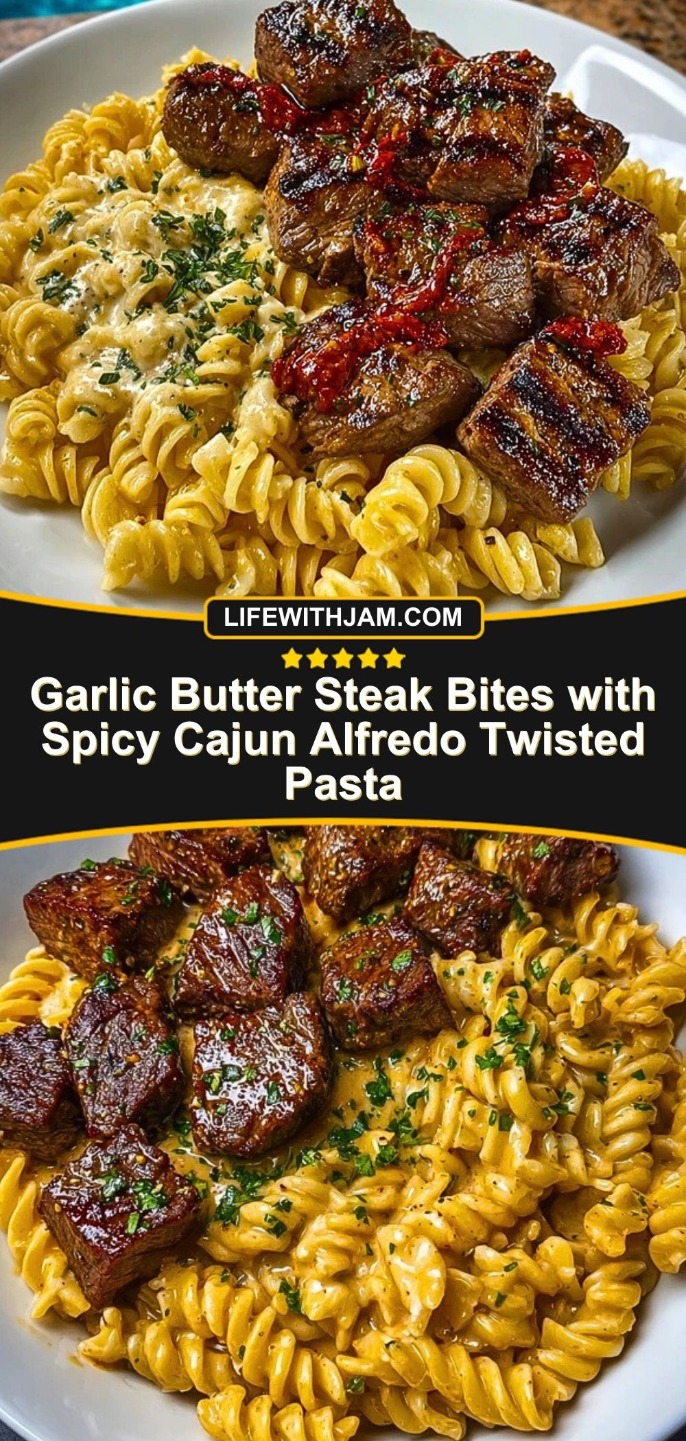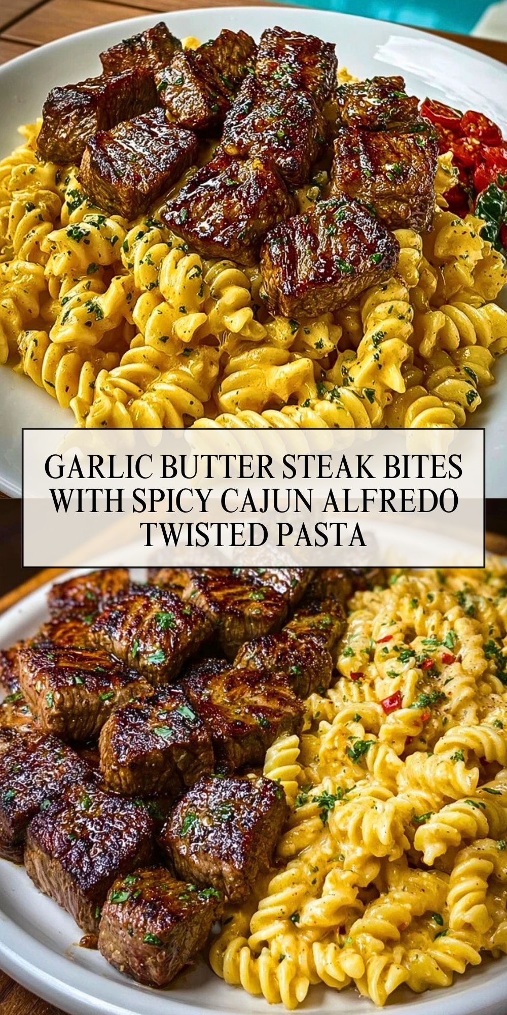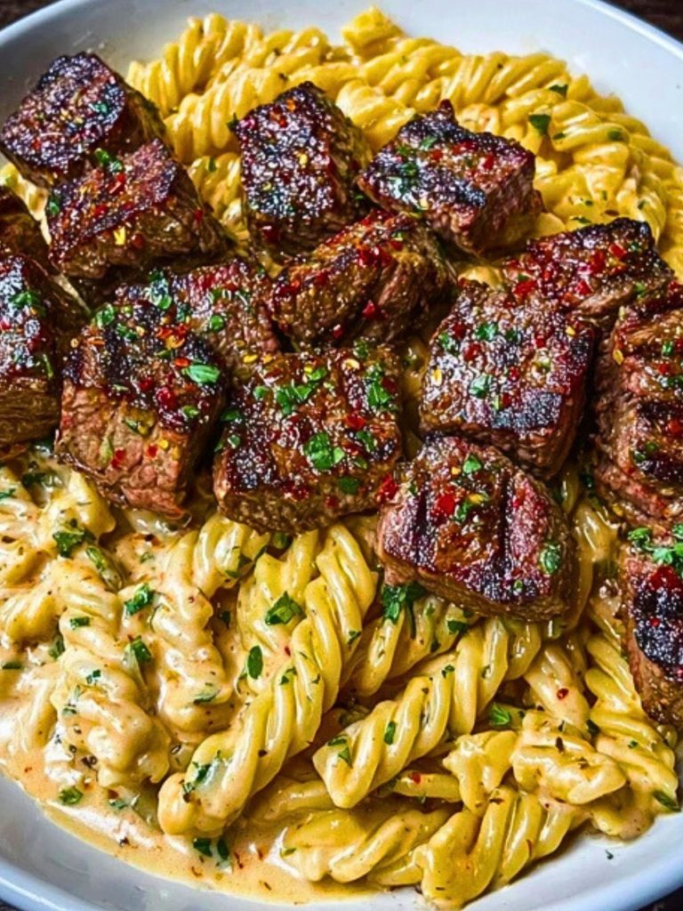 Garlic Butter Steak Bites with Spicy Cajun Alfredo Twisted Pasta