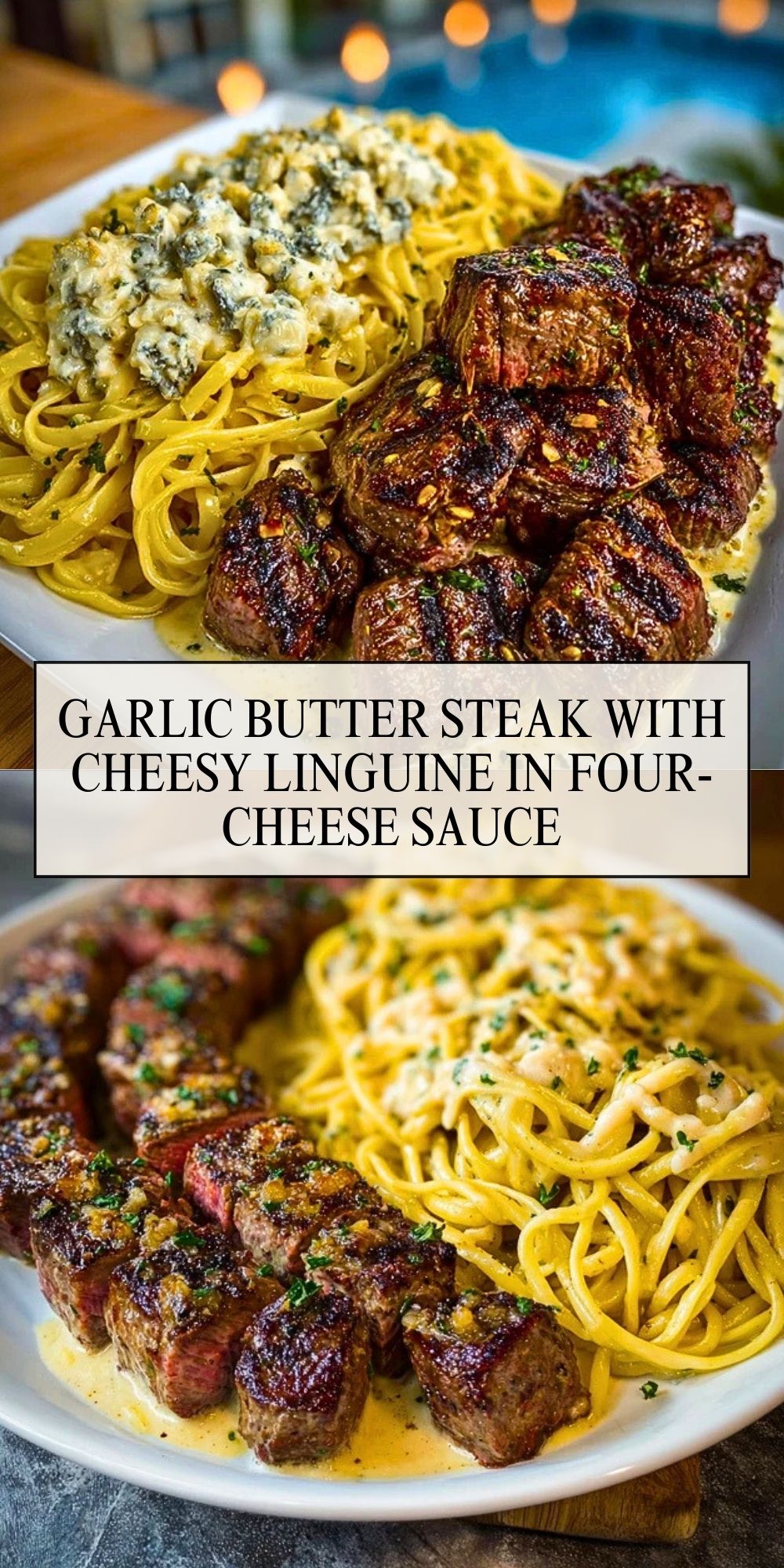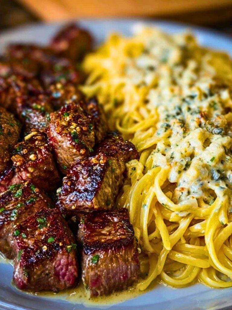 A rich, savory dinner featuring garlic butter-seared steak bites and linguine tossed in a velvety four-cheese sauce. Perfect for impressing guests or elevating your weekday meals with indulgent comfort.