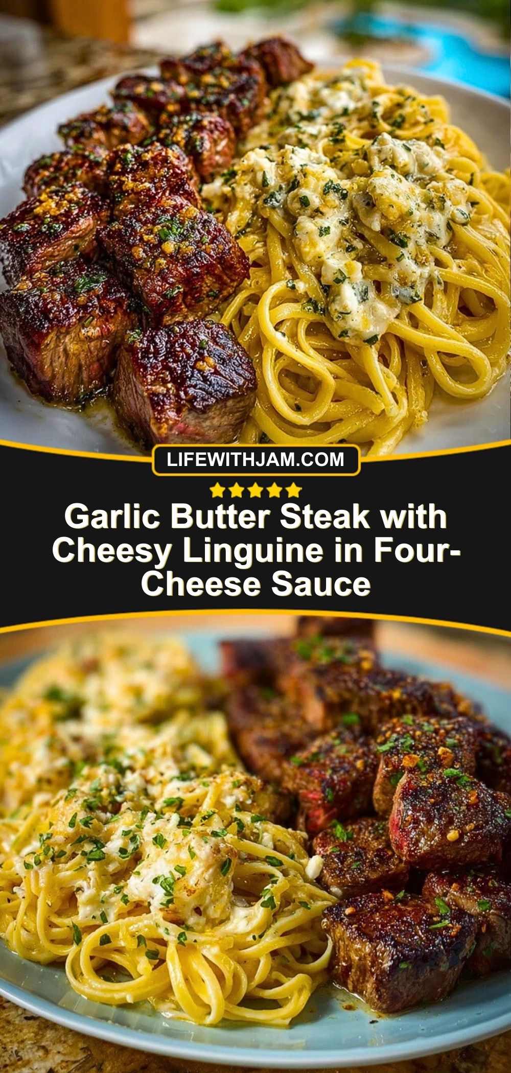 Add the drained linguine directly into the cheese sauce and toss to coat evenly. Plate the creamy pasta and spoon the garlic butter steak bites alongside or on top. Garnish with fresh chopped parsley and extra cheese, if desired. Serve hot and enjoy every indulgent bite.